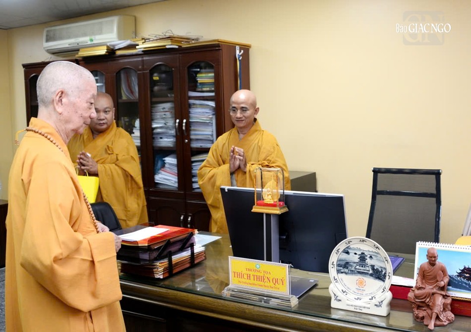 Dịp này, Đức Pháp chủ mở cửa Văn phòng Hội đồng Chứng minh đặt tại Việt Nam Quốc Tự; cùng chư tôn đức Ban Trị sự GHPGVN TP.HCM thực hiện nghi thức mở cửa, thăm Văn phòng Ban Trị sự TP.HCM, khối văn phòng hành chánh của các ban chuyên môn.