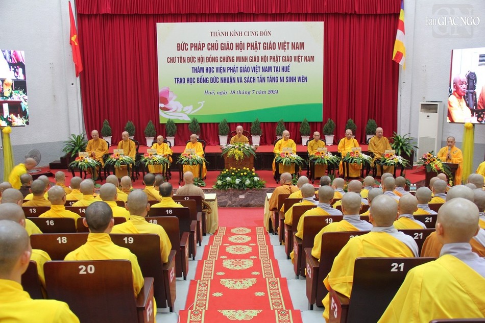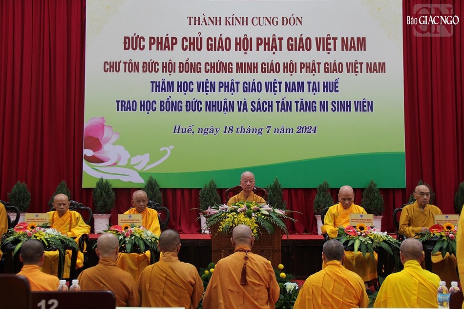 Chiều cùng ngày, Đức Pháp chủ cùng chư tôn giáo phẩm Hội đồng Chứng minh, lãnh đạo Ban Trị sự GHPGVN tỉnh Thừa Thiên Huế đã quang lâm Học viện Phật giáo VN tại Huế (cơ sở II, P.An Tây), trao học bổng Đức Nhuận hỗ trợ việc tu học của Tăng Ni trẻ.