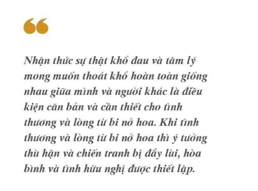 Nhận thức sự thật khổ đau và tâm lý mong muốn thoát khổ hoàn toàn giống nhau giữa mình và người khác là điều kiện căn bản và cần thiết cho tình thương và lòng từ bi nở hoa. Khi tình thương và lòng từ bi nở hoa thì ý tưởng thù hận và chiến tranh bị đẩy lùi, hòa bình và tình hữu nghị được thiết lập.