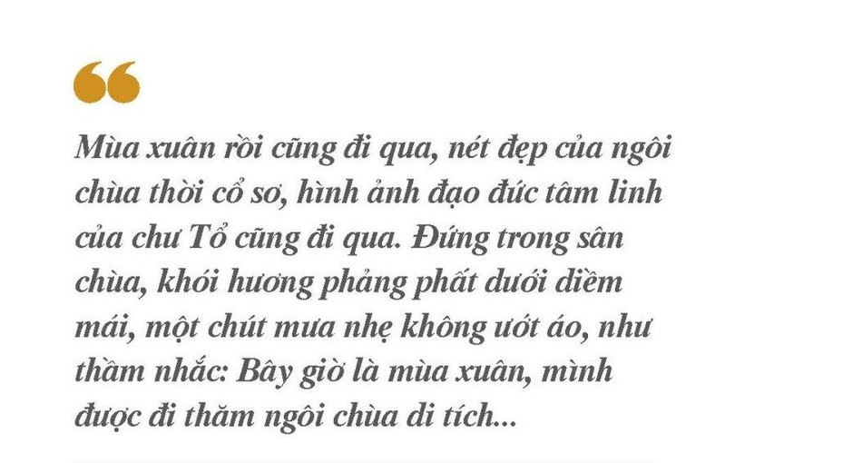 Ngôi chùa hôm nay, bình yên giữa miền đất có nhiều thay đổi. Phố thị xa hoa, người người sang trọng đưa nhau đi lễ Phật, lướt qua những di tích của một thời xa xưa. Mùa xuân rồi cũng đi qua, nét đẹp của ngôi chùa thời cổ sơ, hình ảnh đạo đức tâm linh của chư Tổ cũng đi qua. Đứng trong sân chùa, khói hương phảng phất dưới diềm mái, một chút mưa nhẹ không ướt áo, như thầm nhắc: Bây giờ là mùa xuân, mình được đi thăm ngôi chùa di tích.