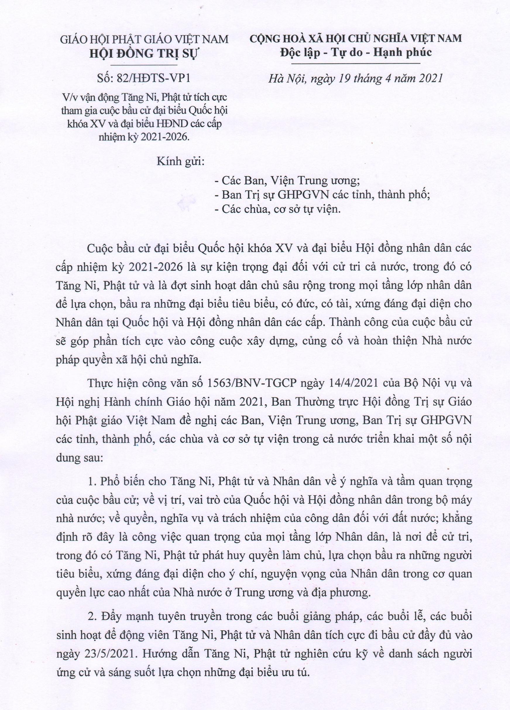 Ban Thường trực Hội đồng Trị sự GHPGVN đề nghị các Ban, Viện Trung ương, Ban Trị sự GHPGVN các tỉnh, thành phố, các chùa và cơ sở tự viện trong cả nước quan tâm thực hiện góp phần để cuộc bầu cử diễn ra thành công và thực sự là ngày hội của toàn dân.