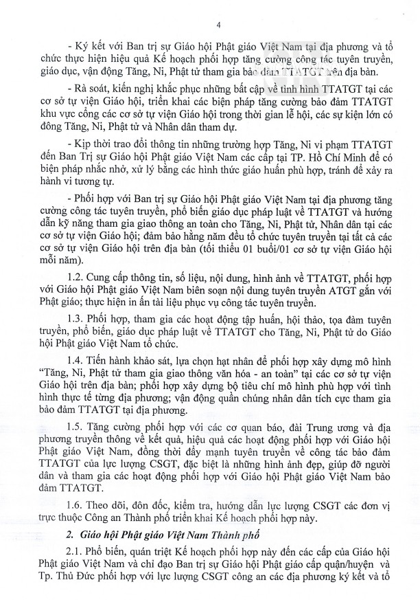 GNO - Văn bản kế hoạch số 4115/KHPH-CATPHCM-GHPGVNTPHCM giữa lãnh đạo GHPGVN TP.HCM và Công an TP.HCM ký ngày ngày 4-8-2023 được phổ biến về tăng cường công tác tuyên truyền, phổ biến, giáo dục, vận động Tăng Ni, Phật tử tham gia bảo đảm trật tự, an toàn giao thông trên địa bàn TP.HCM giai đoạn 2023-2026.