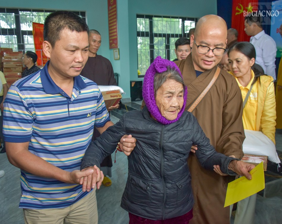 | Thượng tọa Thích Tuệ Hải hỗ trợ một cụ ông nhận quà |