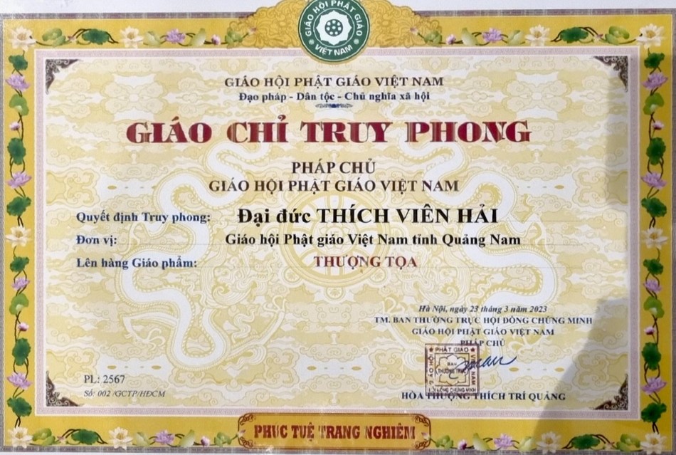 Trước đó, Ban Trị sự GHPGVN tỉnh Quảng Nam cũng đã có Tờ trình số 136/TTr/BTS ngày 22-3-2023 do Hòa thượng Thích Phước Minh, Ủy viên Hội đồng Trị sự, Trưởng ban Trị sự Phật giáo tỉnh ký gửi Ban Thường trực Hội đồng Trị sự xin truy phong giáo phẩm Thượng tọa đối với Đại đức Thích Viên Hải.