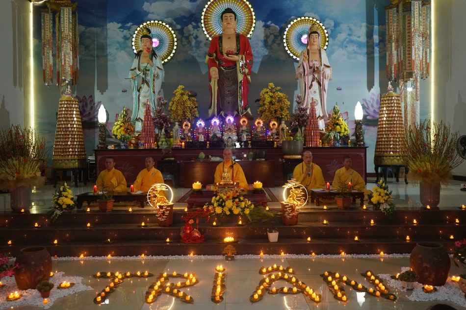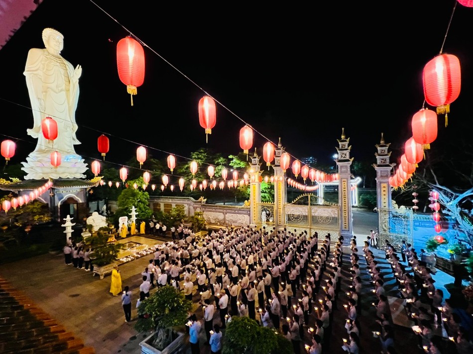 Trong không khí trang nghiêm và thanh tịnh, những ngọn nến lung linh tượng trưng cho ánh sáng từ bi và trí tuệ của chư Phật, Bồ-tát đã được các huynh trưởng Gia đình Phật tử thành kính dâng lên cúng dường Tam bảo và kết thành huy hiệu hoa sen của tổ chức Gia đình Phật tử Việt Nam với châm ngôn Bi - Trí - Dũng trước tôn tượng Đức Phật A Di Đà tại chùa Bà Đa.