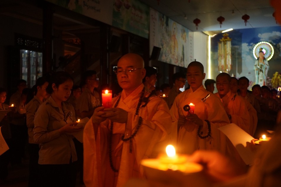 Sau đó, Thượng tọa trụ trì cùng chư Tăng đã hướng dẫn các giới tử thắp nến tri ân, hô canh ngôi thiền theo chương trình của khóa tu.