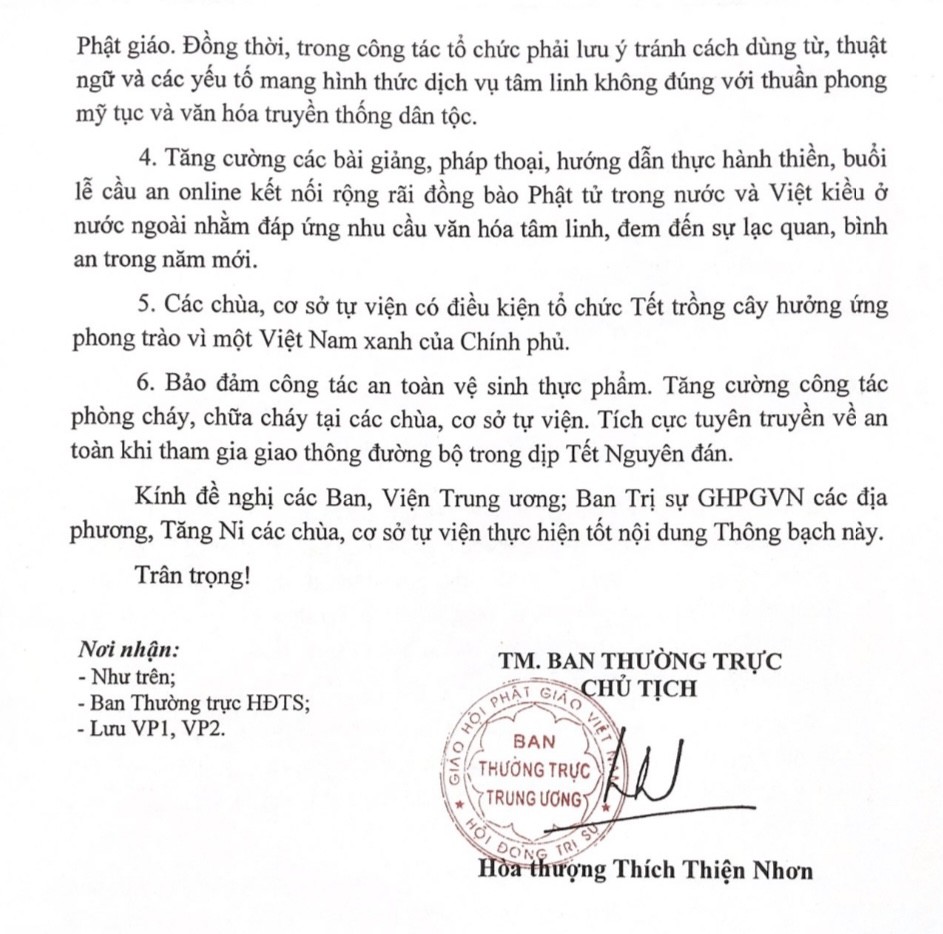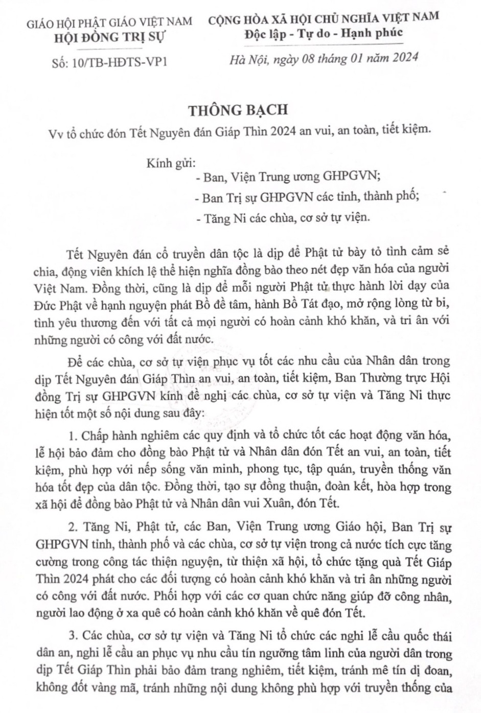 GNO - Hôm nay, 8-1, Hòa thượng Thích Thiện Nhơn, Chủ tịch Hội đồng Trị sự GHPGVN ban hành Thông bạch số 10/TB-HĐTS-VP1 của Hội đồng Trị sự về tổ chức đón Tết Nguyên đán Giáp Thìn 2024 an vui, an toàn, tiết kiệm.