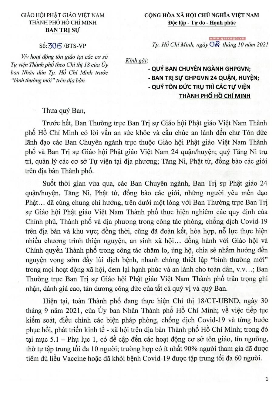 Theo đó, hiện tại, toàn Thành phố đang thực hiện Chỉ thị 18/CT-UBND, ngày 30-9-2021 của Ủy ban Nhân TP.HCM về việc tiếp tục kiểm soát, điều chỉnh các biện pháp phòng, chống dịch Covid-19 và từng bước phục hồi, phát triển kinh tế - xã hội trên địa bàn Thành phố; trong đó tại mục 5.1 - Phụ lục 1, có đề cập đến các hoạt động cơ sở tôn giáo, tín ngưỡng, thờ tự tập trung tối đa 10 người; trường hợp có ít nhất 90% người tham gia đã được tiêm đủ liều vắc-xin hoặc đã khỏi bệnh Covid-19 được tập trung tối đa 60 người.