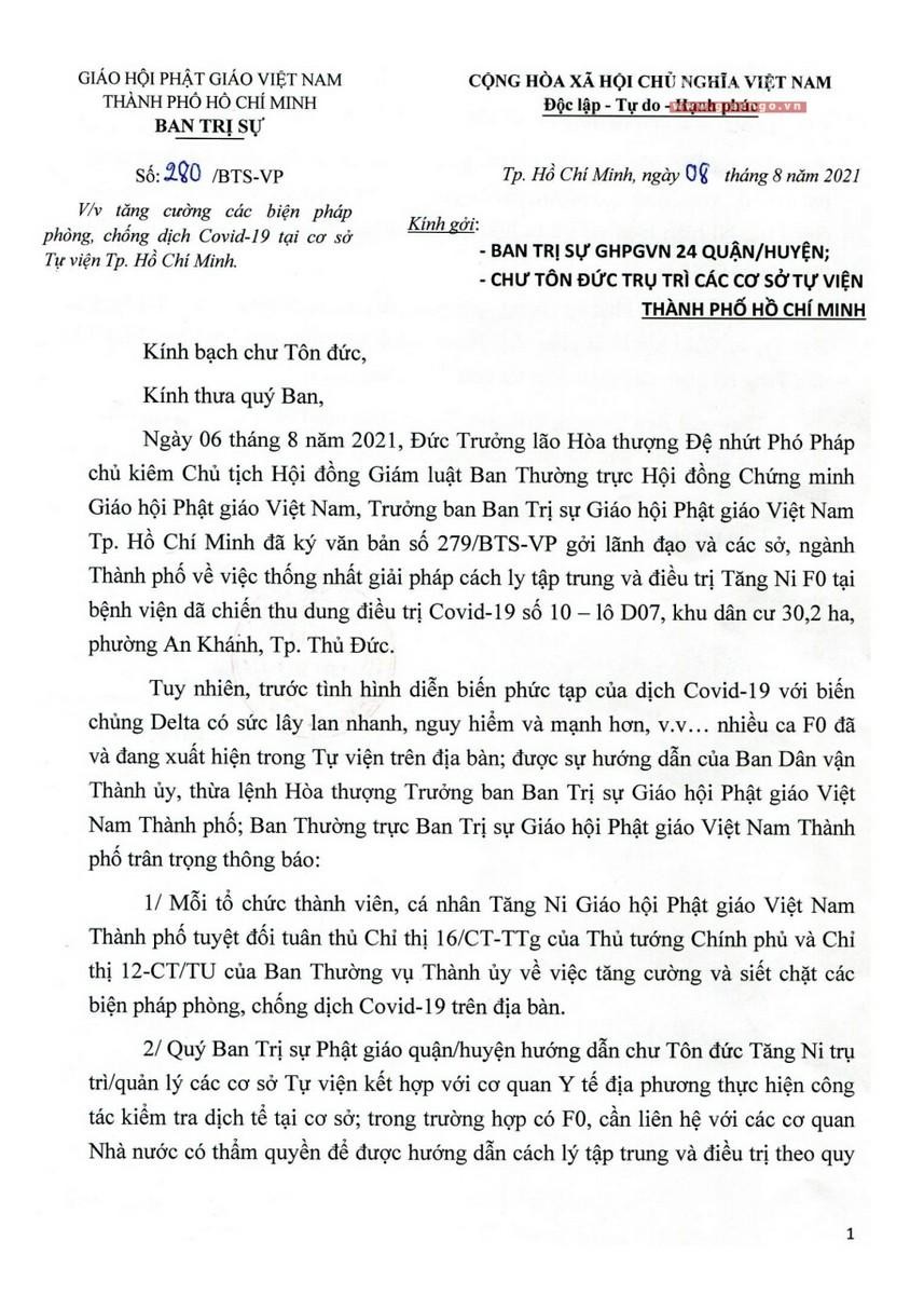 Công văn nêu: Ngày 6 tháng 8 năm 2021, Đức Trưởng lão Hòa thượng Đệ nhất Phó Pháp chủ kiêm Chủ tịch Hội đồng Giám luật Ban Thường trực Hội đồng Chứng minhGHPGVN, Trưởng ban Ban Trị sự GHPGVN TP.HCM đã ký văn bản số 279/BTS-VP gởi lãnh đạo và các sở, ngành Thành phố về việc thống nhất giải pháp cách ly tập trung và điều trị Tăng Ni F0 tại bệnh viện dã chiến thu dung điều trị Covid-19 số 10 - lô D07, khu dân cư 30,2 ha, phường An Khánh, TP.Thủ Đức.