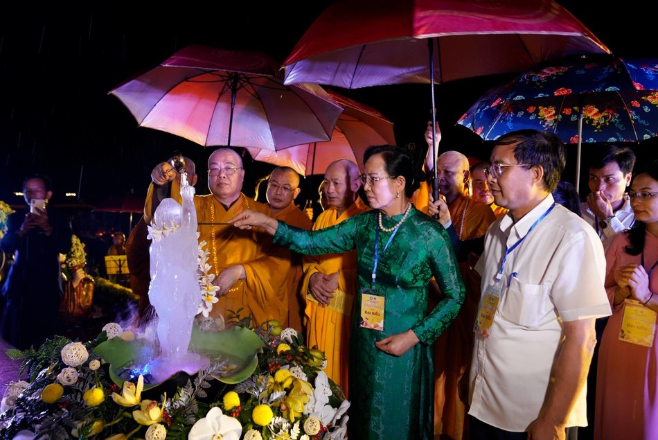 Hòa thượng Thích Thanh Nhiễu tiến về trước lễ đài, thành kính dâng hương cúng dường ngày khánh đản. Thượng tọa Thích Minh Quang xướng lễ cử hành nghi thức Phật đản truyền thống, dưới cơn mưa nặng hạt, lời kinh Khánh đản được đại chúng cùng nhau tụng niệm ngân vang kính mừng và tri ân một bậc Đại Giác ngộ, Ngài đã đến đã mang ánh sáng trí tuệ phá tan màn tối vô minh, giúp chúng sanh tìm về chánh đạo.