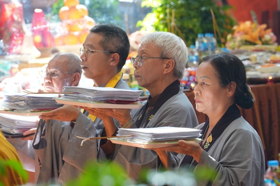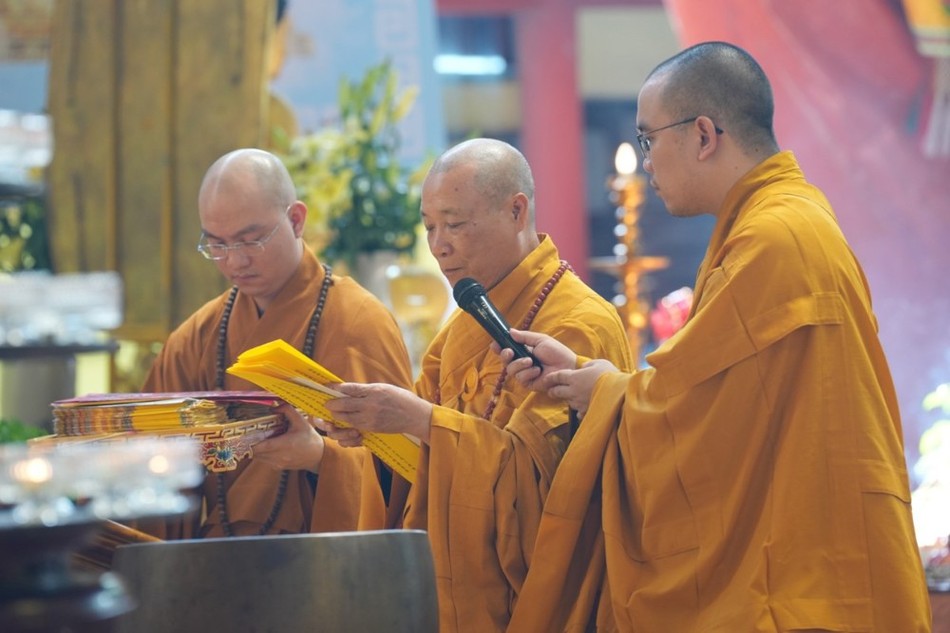 Sau thời pháp thoại ý nghĩa mà Thượng tọa truyền trao, dưới sự chủ lễ của chư Tăng bổn tự, đại chúng tiếp tục thời khóa tụng kinh Dược Sư cầu nguyện thế giới hòa bình, Phật pháp xương minh, chúng sinh an lạc.