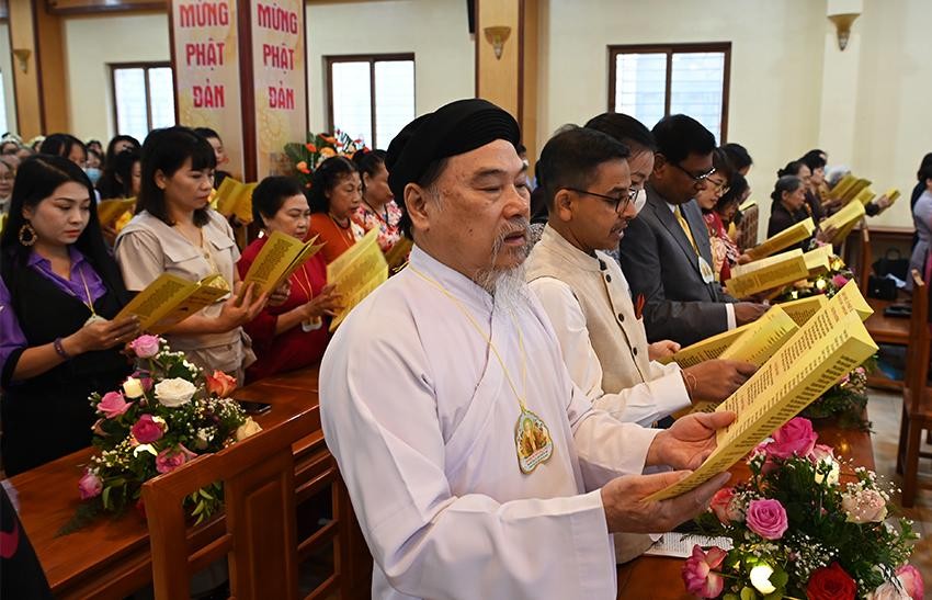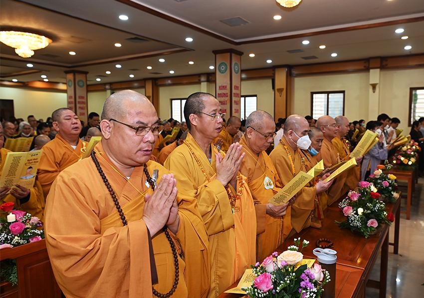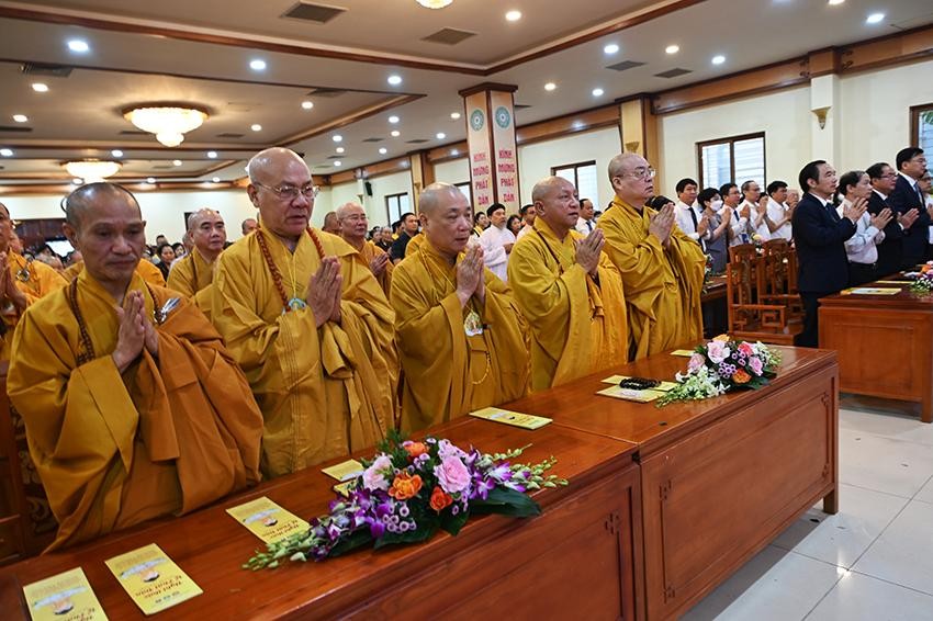 Tiếp sau đó, các chư tôn đức lãnh đạo GHPGVN trang nghiêm cử hành nghi lễ dâng hương, tụng kinh Chuyển Pháp luân và nghi thức tắm Phật truyền thống.
