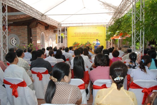 Cuối buổi lễ, chư tôn đức cùng quý vị quan khách tham dự đã tiến hành gắn biển công trình tu bổ tôn tạo di tích chùa Kim Liên chào mừng kỷ niệm 1.000 năm Thăng Long - Hà Nội.