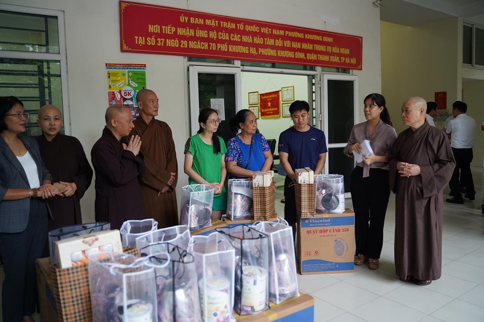Tại UBND P.Khương Đình, Hòa thượng Thích Bảo Nghiêm đã thay mặt chư tôn đức Ban Trị sự có lời động viên, chia sẻ đến đại diện các gia đình là nạn nhân trong đám cháy vừa qua. Bên cạnh đó, chư tôn đức trao tặng 45 phần quà động viên tinh thần đến các gia đình đang chịu mất mát nặng nề.