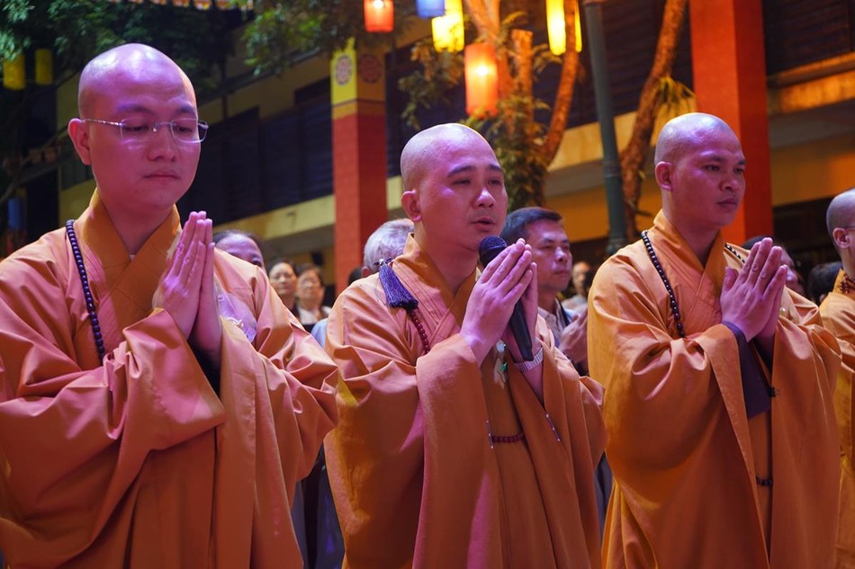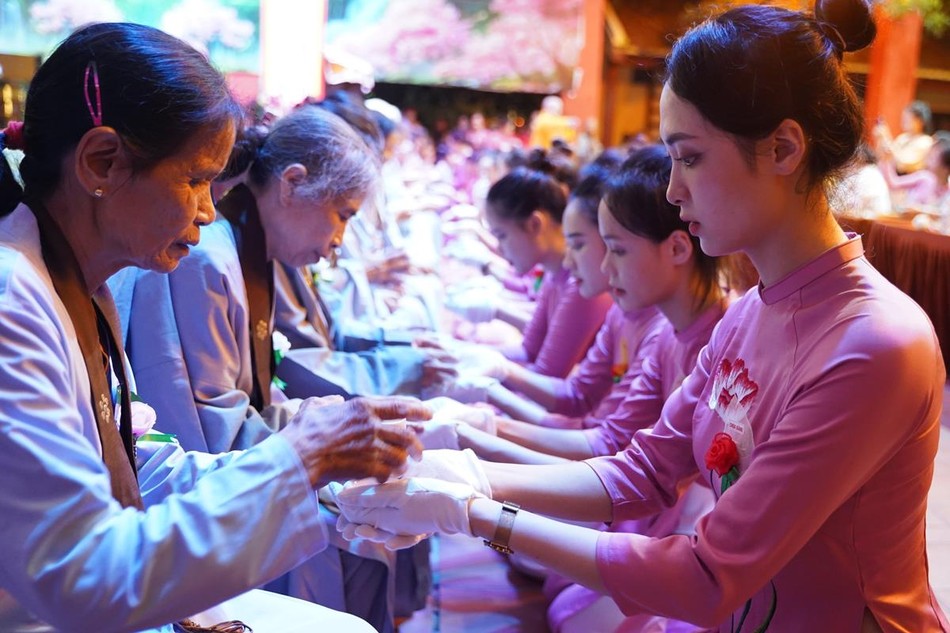 Trong niềm hoài cảm sâu lắng về hai đấng sinh thành, đại chúng đã cùng lắng đọng tâm tư nghe NSND Lan Hương đọc bài cảm niệm Vu lan. Các bạn thanh thiếu niên cũng đã thực hiện nghi thức cài hoa hồng.
