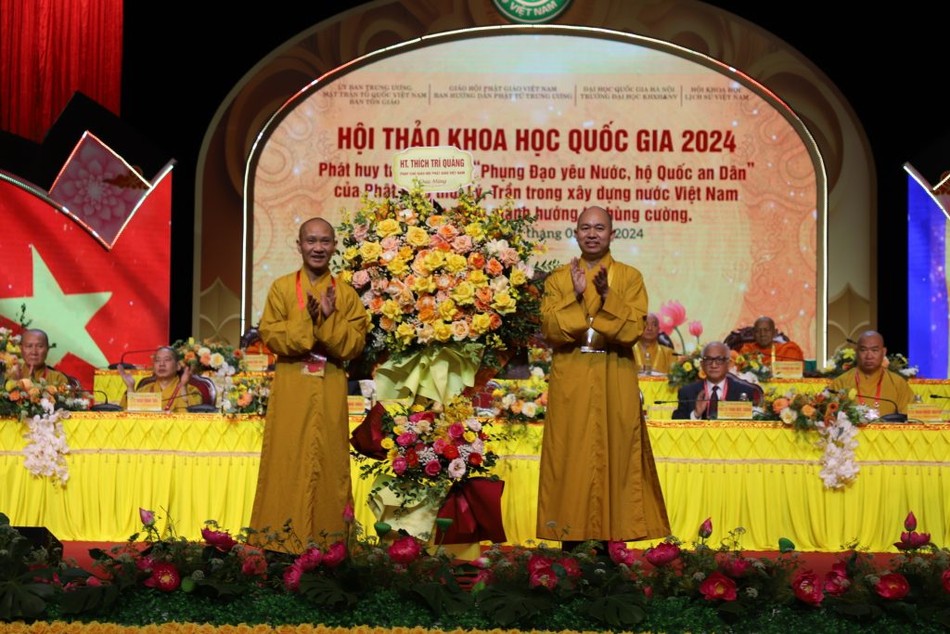 Thượng tọa Thích Đức Thiện đọc thư chúc mừng của Đức Pháp chủ GHPGVN tới hội thảo. Thư Đức pháp chủ GHPGVN nhấn mạnh: “Trước hết, tôi tán dương công đức Ban Hướng dẫn Phật tử T.Ư GHPGVN đã tổ chức Hội thảo khoa học Quốc gia với chủ đề “Phát huy truyền thống ‘phụng đạo yêu nước, hộ quốc an dân’ của Phật giáo thời kỳ Lý, Trần trong xây dựng nước Việt Nam phát triển, giàu mạnh hướng tới hùng cường”.