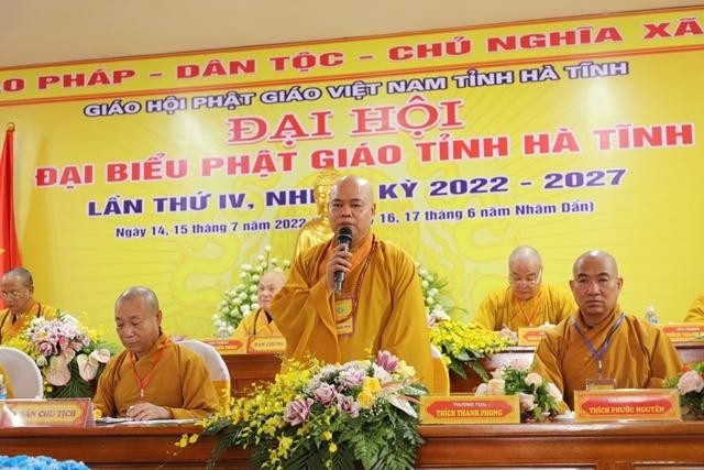 Phát biểu khai mạc, Hòa thượng Thích Bảo Nghiêm, Trưởng ban Tổ chức Đại hội nhấn mạnh Đại hội đại biểu GHPGVN tỉnh Hà Tĩnh khóa IV, nhiệm kỳ 2022-2027 với tinh thần “Kỷ cương – Trách nhiệm – Đoàn kết và phát triển”, bằng trí tuệ Bát Nhã của người con Phật, nhìn thẳng vào thực tiễn, đại hội sẽ tập trung thảo luận, rút ra những ưu điểm để phát huy, những hạn chế tồn tại để khắc phục, trên cơ sở đó đề ra chương trình hoạt động Phật sự trong nhiệm kỳ tới. Thông qua đại hội, chúng ta sẽ suy cử được thành phần nhân sự Ban Trị sự khóa IV, nhiệm kỳ 2022-2027 có đầy đủ uy tín, năng lực, đạo hạnh để thực hiện các công tác Phật sự mà Đại hội giao phó”.