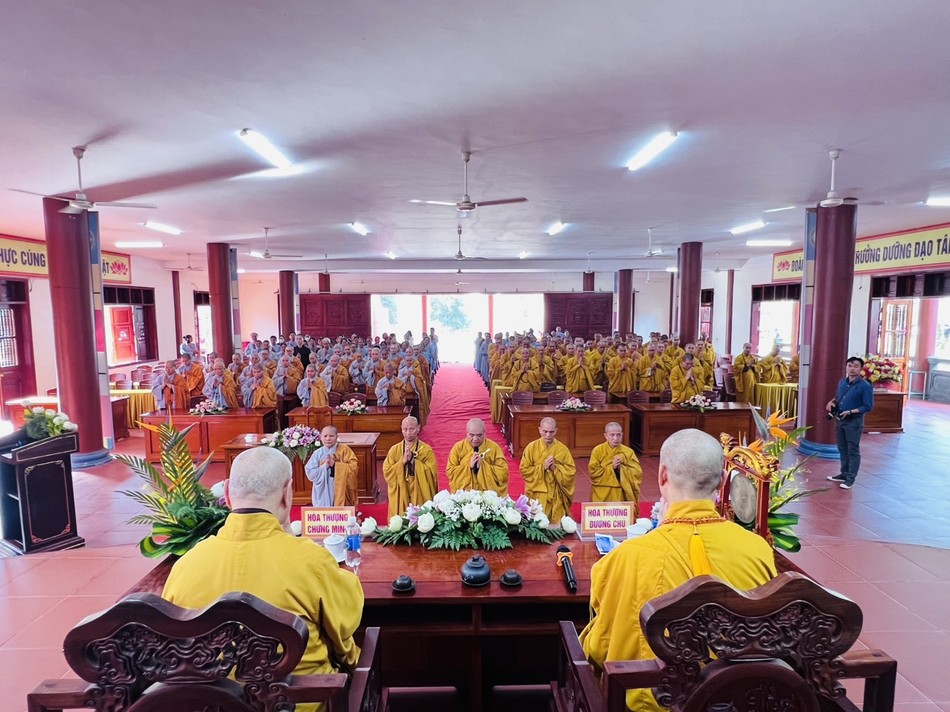 Tại đây, Hòa thượng Thích Bảo Nghiêm, Phó Chủ tịch Hội đồng Trị sự, Trưởng ban Trị sự GHPGVN tỉnh Hà Tĩnh, Đường chủ hạ trường đã báo cáo công tác tổ chức khóa An cư kiết hạ Phật lịch 2567 của Ban Trị sự, đồng thời thay mặt Phật giáo tỉnh Hà Tĩnh cung thỉnh Hòa thượng Chủ tịch Hội đồng Trị sự ban pháp thoại nhằm sách tấn chư Tăng Ni hành giả và đạo tràng Phật tử trên con đường tu học và hành đạo.