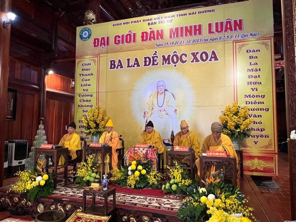 Ban Tổ chức Đại giới đàn cung an chức sự, nhất tâm cung thỉnh Giới đàn Tăng: Hòa thượng Thích Quảng Tùng, đương vi Đường đầu Hòa thượng; Thượng tọa Thích Thanh Vân, đương vi Yết-ma A-xà-lê; Thượng tọa Thích Thanh Dũng, đương vi Giáo thụ A-xà-lê; Thượng tọa Thích Thanh Thắng, Thích Thanh Viễn, đương vi vị tôn chứng Tăng-già; Đại đức Thích Quảng Thuyết làm điển lễ và dẫn thỉnh.