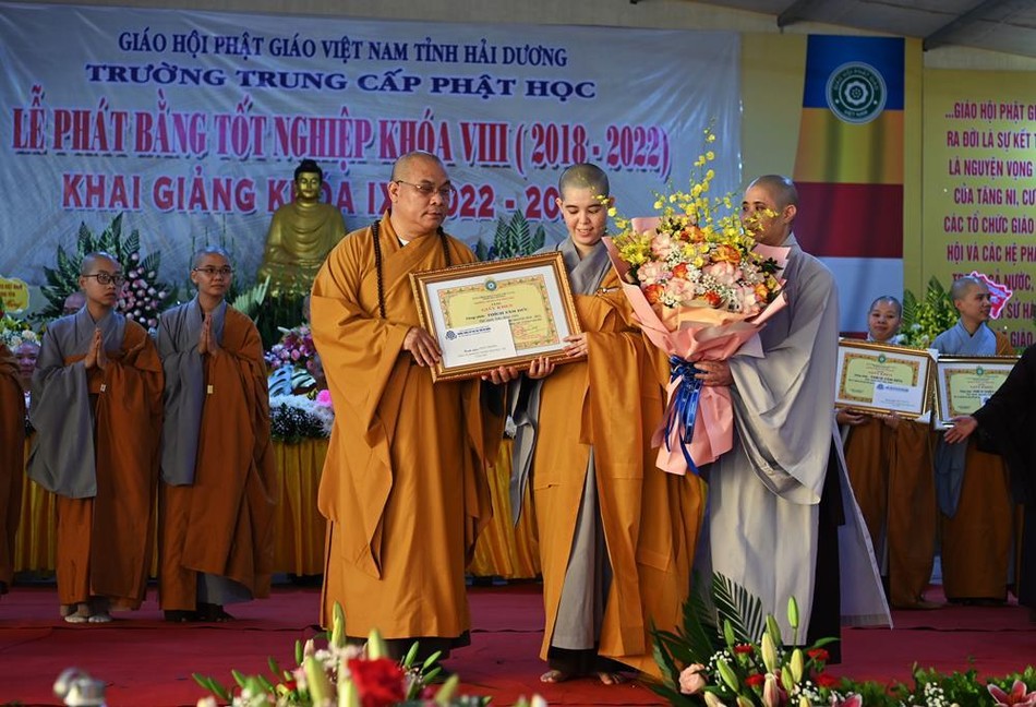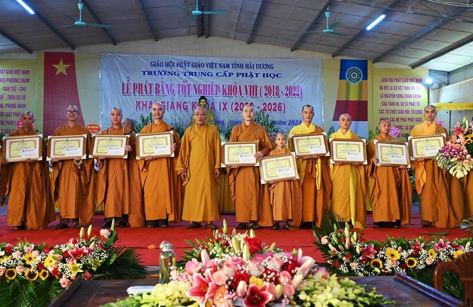 GNO - Sáng 23-9, tại chùa Đống Cao (TP.Hải Dương), Ban Giám hiệu Trường Trung cấp Phật học tỉnh Hải Dương đã long trọng tổ chức lễ phát bằng tốt nghiệp khóa VIII (2018-2022) và khai giảng năm học mới - khóa IX (2022-2026).