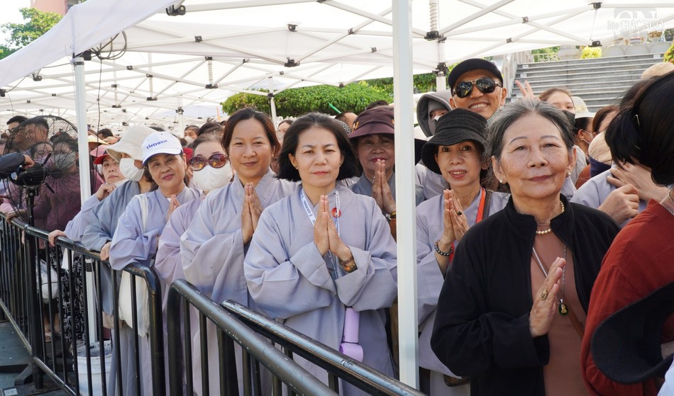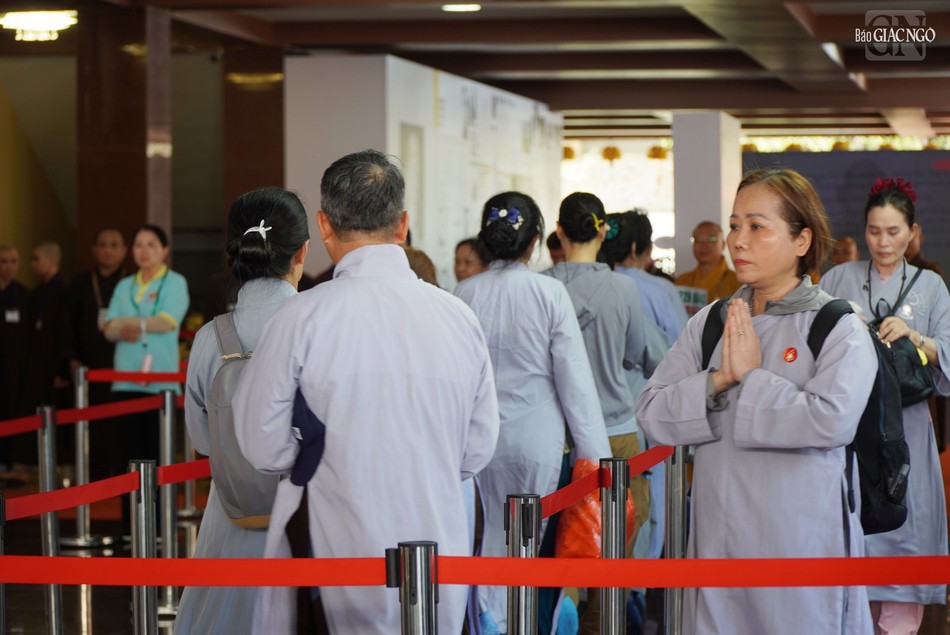 Dòng người thành kính, trang nghiêm thực hiện công tác an ninh, xếp hàng vào chiêm bái xá-lợi Trái tim bất diệt của Bồ-tát Thích Quảng Đức - biểu tượng cho tinh thần từ bi, trí tuệ của Phật giáo Việt Nam, với bao niềm xúc động thiêng liêng.
