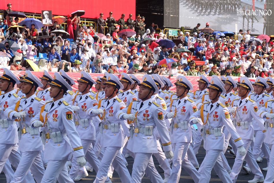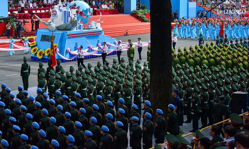 Đúng 8 giờ 7 phút, sau khẩu lệnh của Thượng tướng Nguyễn Văn Nghĩa, Phó Tổng tham mưu trưởng QĐND Việt Nam, cuộc diễu binh, diễu hành chính thức bắt đầu với biên đội trực thăng kéo cờ Đảng, cờ Tổ quốc và các biên đội chiến đấu cơ của Không quân bay trình diễn trên bầu trời TP.HCM. Tiếp đó, các khối diễu binh, diễu hành theo thứ tự gồm 4 khối nghi trượng; 23 khối quân đội và dân quân tự vệ; 12 khối công an; 12 khối diễu hành quần chúng.