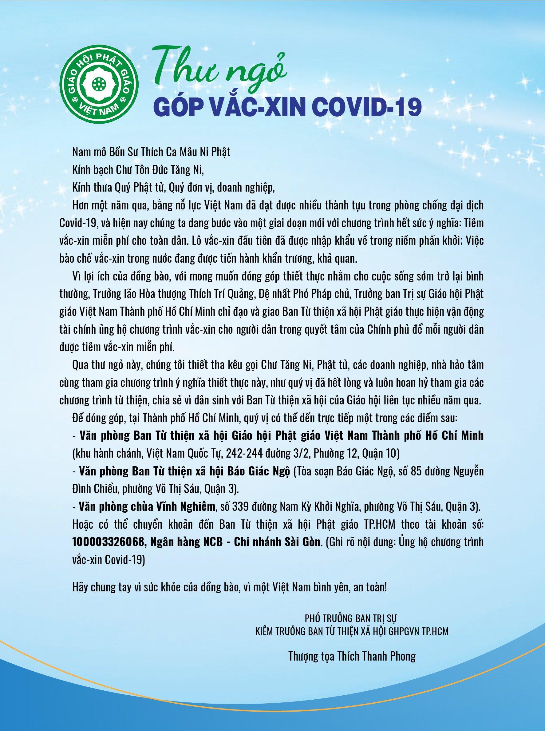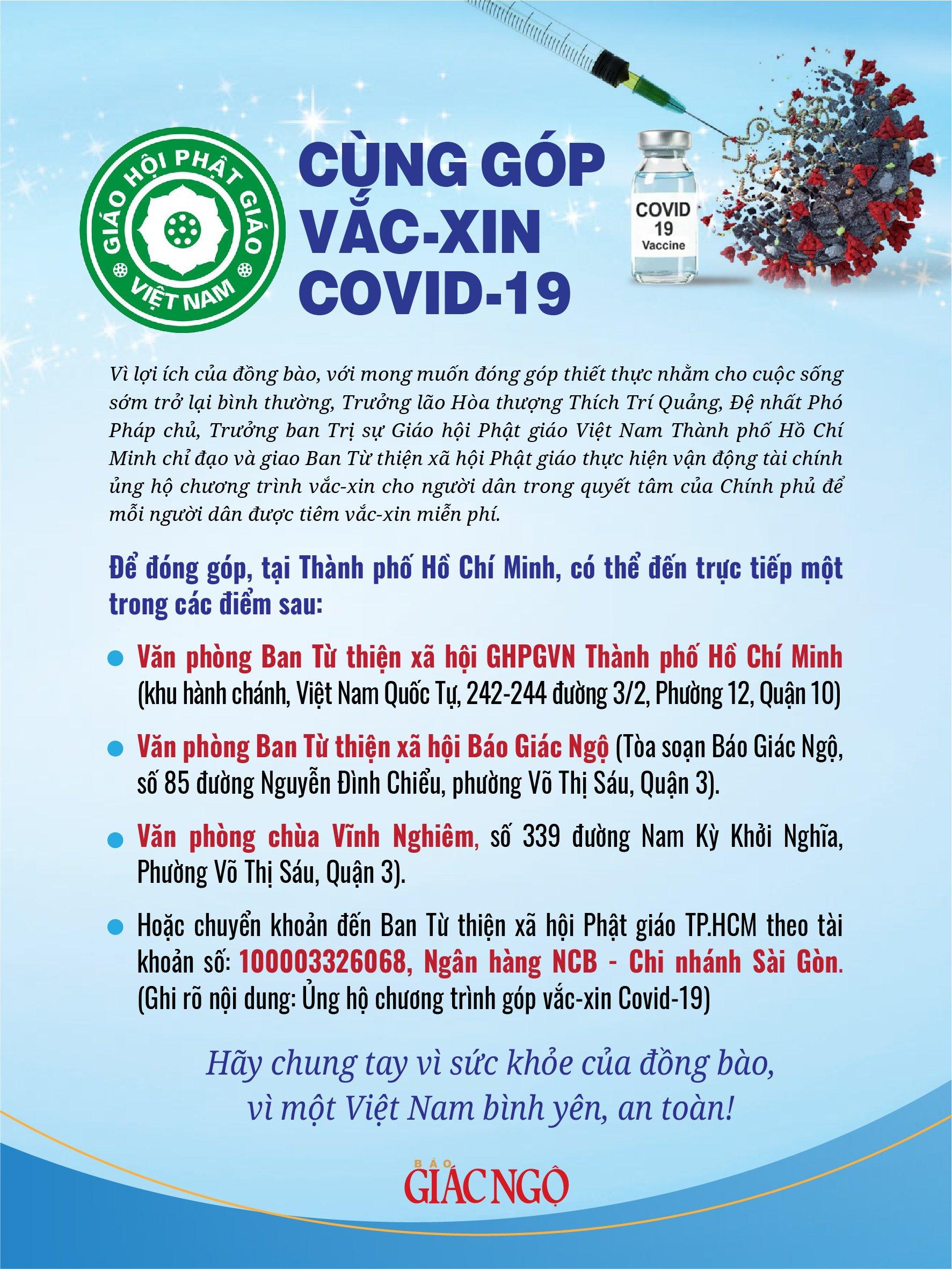 Các khoản đóng góp sẽ được tập trung về Ban Trị sự GHPGVN TP.HCM để chuyển trực tiếp vào quỹ phòng chống Covid-19, cho mục đích mua vắc-xin cho đối tượng người nghèo, trong nỗ lực mọi người dân được tiêm vắc-xin Covid-19 miễn phí.