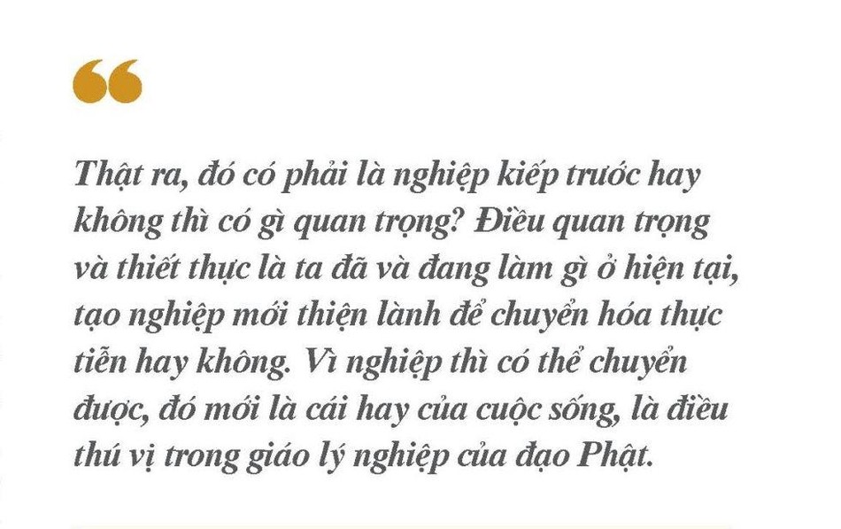 Mong rằng mỗi khi gặp việc không may xảy đến, chúng ta đừng vội kết luận và đổ tất cả đó là do nghiệp đời trước bởi rất nhiều điều là nghiệp của đời này. Nghiệp theo Phật giáo có nghiệp cũ và nghiệp mới. Nghiệp cũ được tạo ra từ đời trước hay quá khứ của đời này. Nghiệp mới là những tạo tác xảy ra gần đây. Điều quan trọng là chúng ta có thể chủ động tạo nghiệp mới thiện lành, nhất là năng lực của nghiệp mới có thể tác động lên nghiệp cũ khiến cho chuyển hóa, thay đổi thực tiễn, khiến chuyện lớn hóa nhỏ, việc nhỏ hóa không.