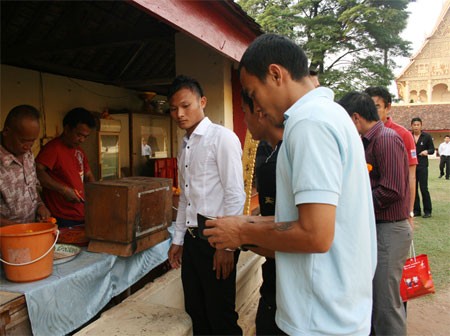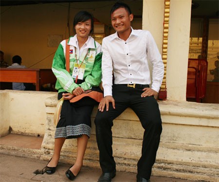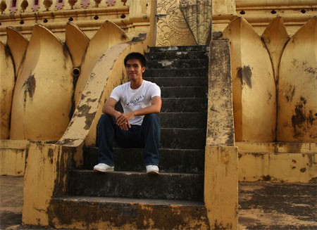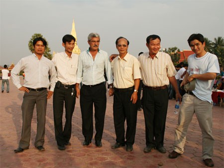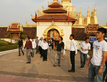 Các tuyển thủ thay phiên chụp ảnh cho nhau làm kỷ niệm về ngôi chùa That Luong, ngay cả thầy “Tô” cũng phải bận rộn với công việc chụp hình để ghi lại những nét kiến trúc đặc sắc, tinh hoa của ngôi chùa đẹp nhất