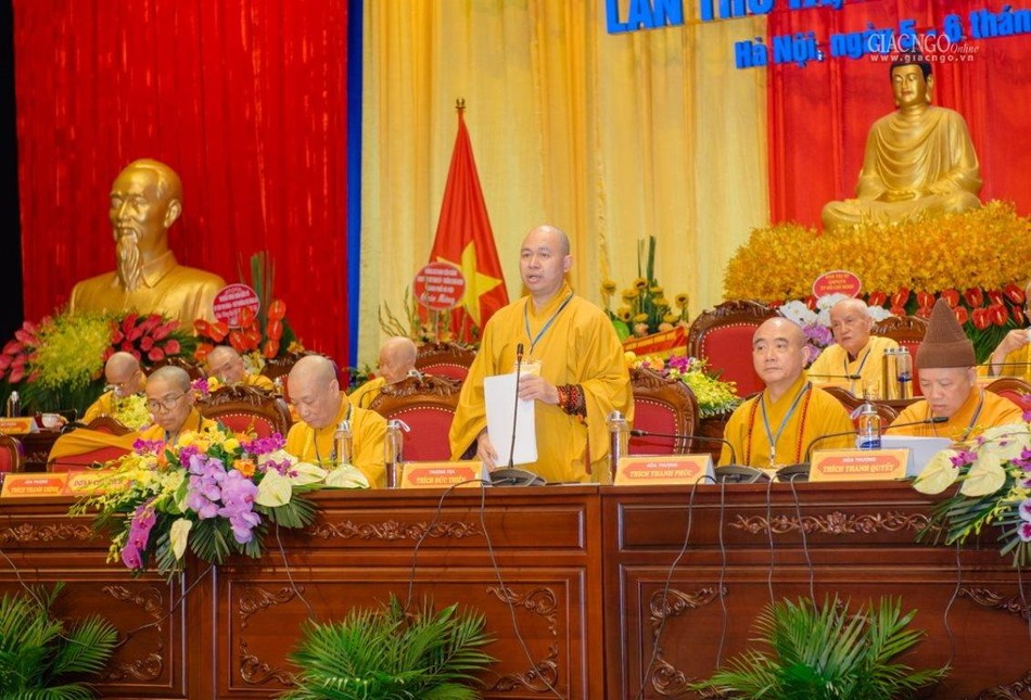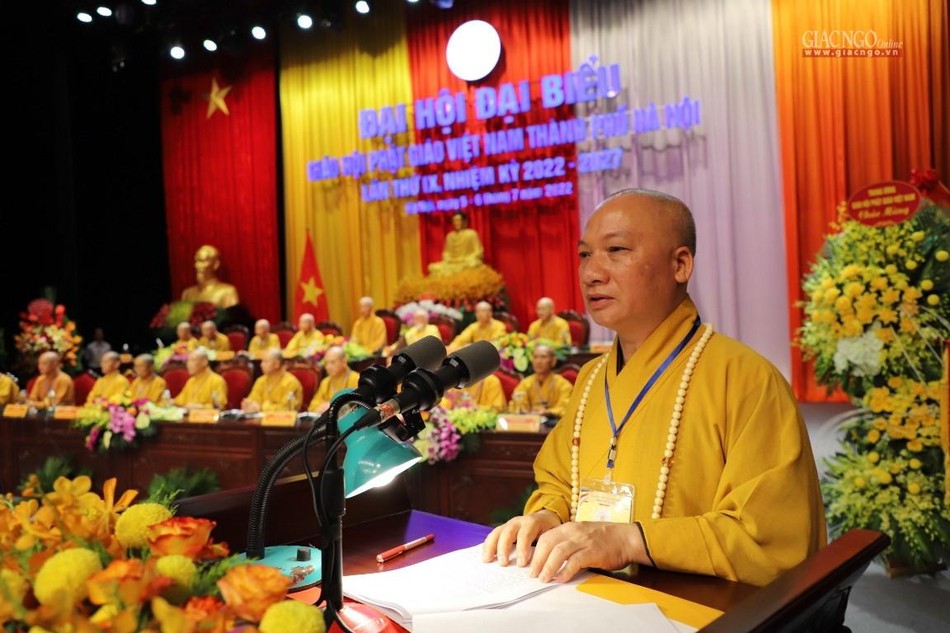 Đại biểu cũng lắng nghe Đại đức Thích Đạo Phong, Chánh Thư ký Ban Trị sự GHPGVN TP.Hà Nội trình chương trình hoạt động Phật sự của GHPGVN TP.Hà Nội nhiệm kỳ 2022-2027 gồm 6 chương trình trọng điểm trong công tác tổ chức, hành chính và xây dựng cơ sở vật chất của Giáo hội, cùng chương trình hoạt động Phật sự cụ thể trên các lĩnh vực Tăng sự, Giáo dục Phật giáo, Hoằng pháp, Hướng dẫn Phật tử, Văn hóa, Nghi lễ, tài chính, từ thiện xã hội.