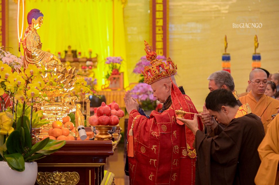 Theo đó, Hòa thượng Thích Lệ Trang làm gia trì sư, cùng chư tôn đức Ban Nghi lễ, Ban Trị sự GHPGVN TP.HCM thực hiện khoa nghi cam lộ thí thực, nhằm cầu nguyện chư hương linh Cửu huyền thất Tổ, anh linh chư vị anh hùng, liệt sĩ, các y bác sĩ tuyến đầu, đồng bào qua đời trong đại dịch Covid-19 được siêu sinh về cõi an lành.