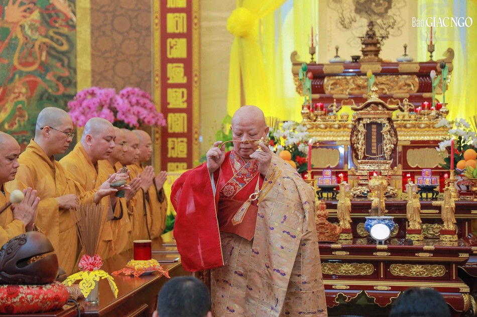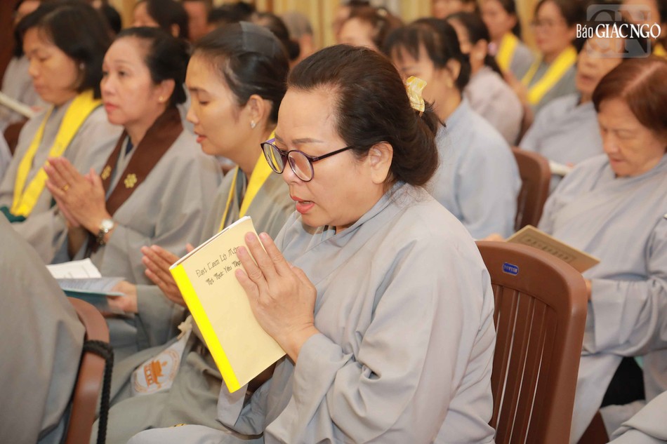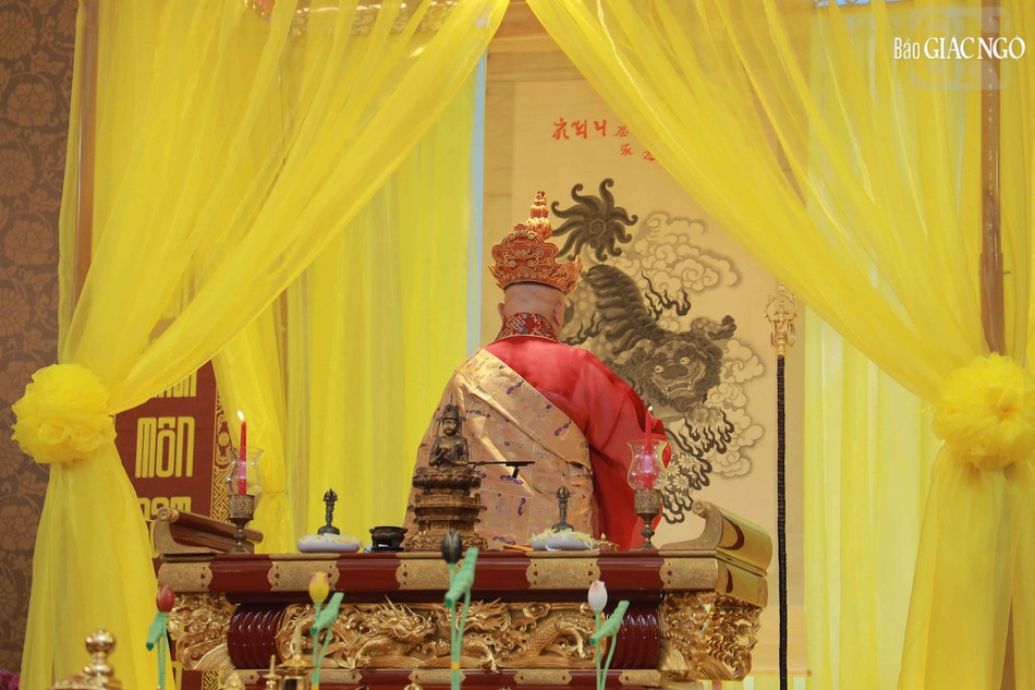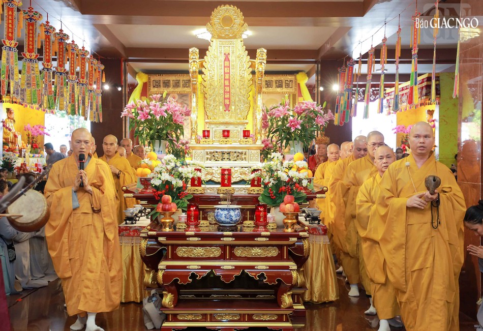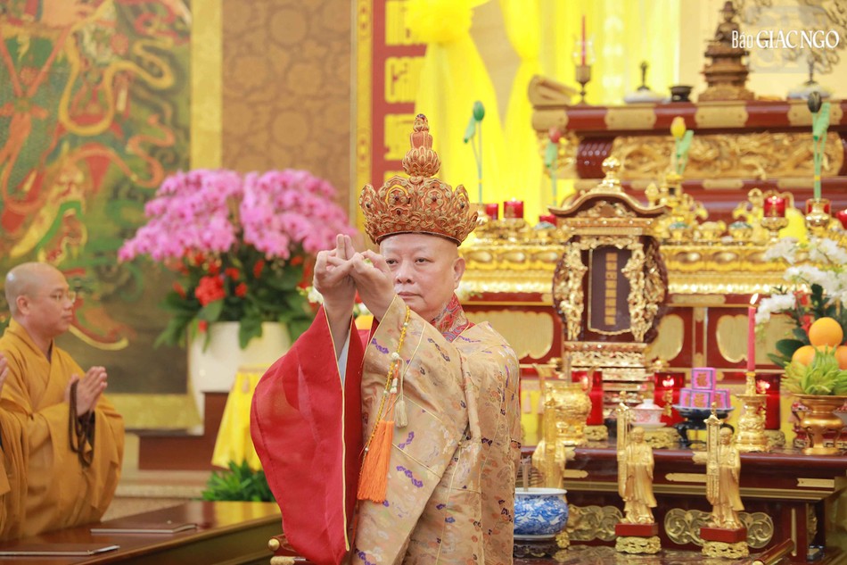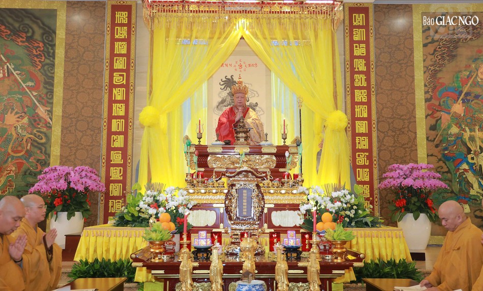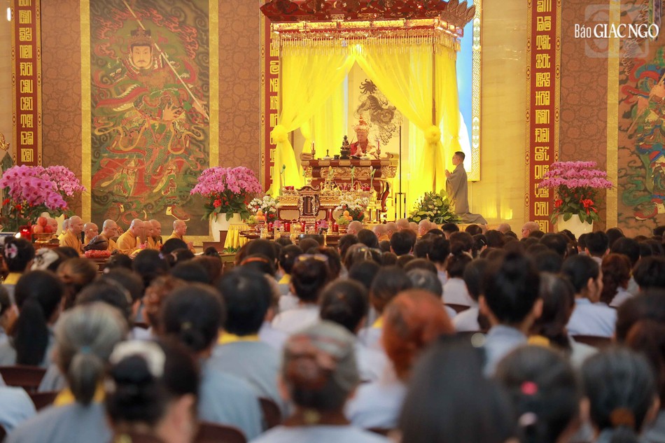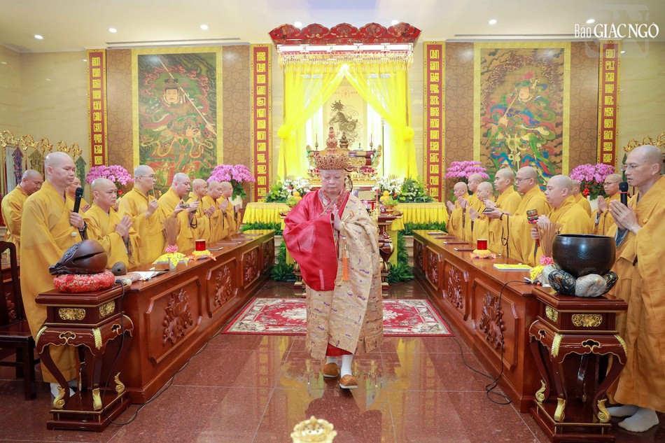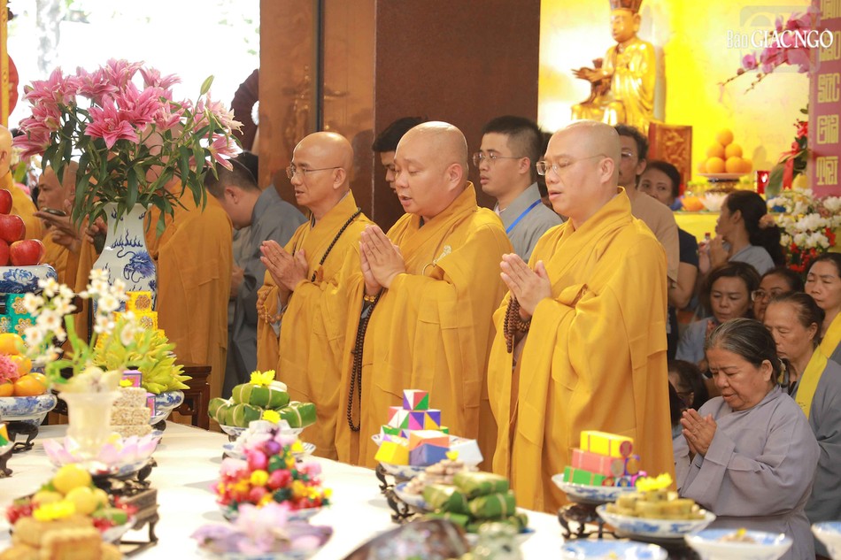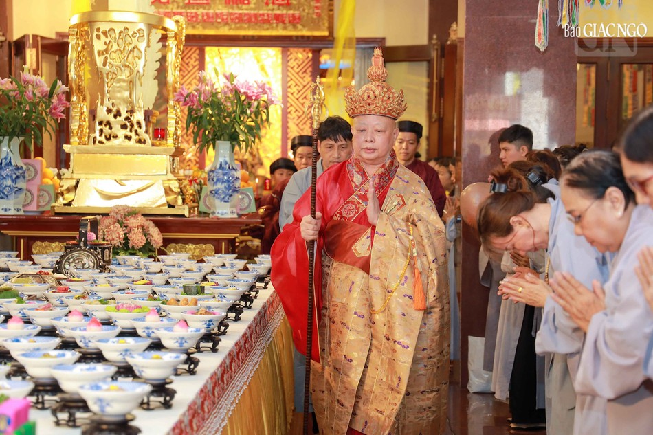 Hòa thượng Thích Lệ Trang, Phó Chủ tịch Hội đồng Trị sự, Trưởng ban Nghi lễ T.Ư, Trưởng ban Trị sự GHPGVN TP.HCM đương vi gia trì sư; cùng chư tôn đức Ban Nghi lễ, Ban Trị sự GHPGVN TP.HCM thực hiện khóa lễ theo khoa nghi Cam lộ thí thực.