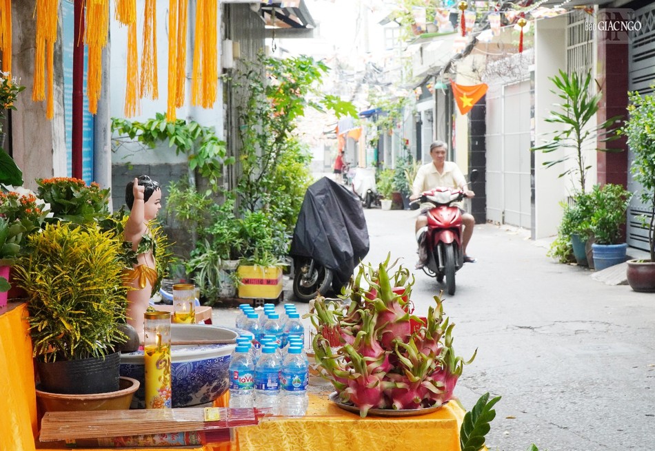 Phật tử Diệu Tịnh (67 tuổi, nhà ở hẻm 159 Trần Văn Đang, Q.3) cho biết bắt đầu thiết trí lễ đài từ 6 năm nay. Do đó, khi thiết trí, nhiều bà con trong hẻm cũng đã cùng góp công sức, rồi người cúng hoa, người cúng nhang, trái cây, tạo nên không khí rất ấm áp quanh lễ đài.