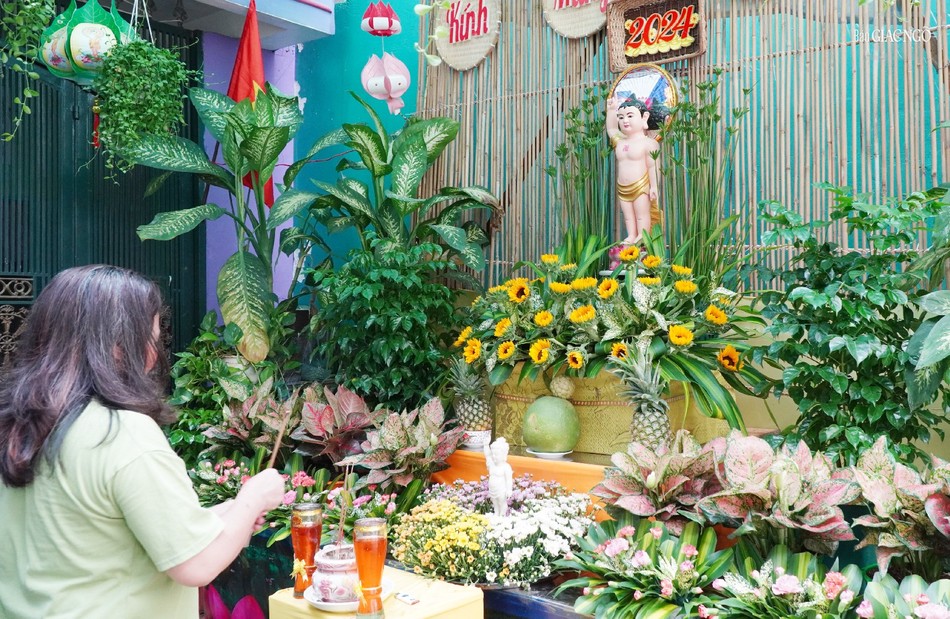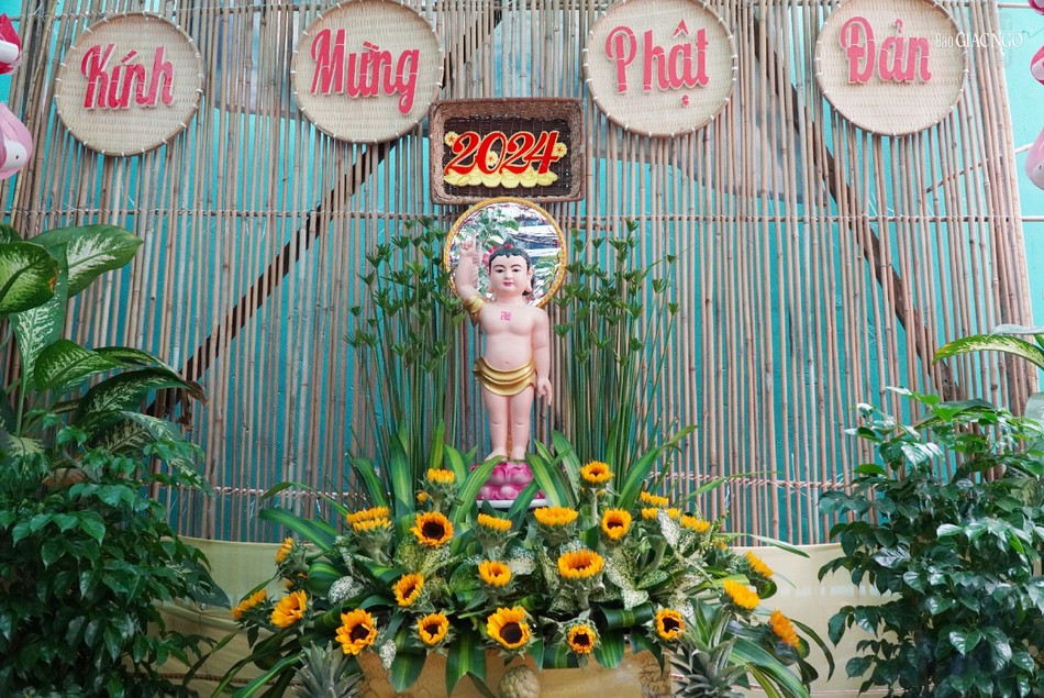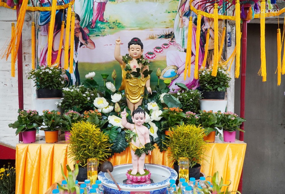 Liên tục suốt 14 năm nay, cứ mỗi tháng Tư ÂL về, gia đình anh Võ Đăng Dũng (hẻm 113 Trần Văn Đang) lại hân hoan niềm vui với không khí thiết trí lễ đài Phật đản, treo cờ, hoa, băng-rôn kính mừng ngày khánh đản của Đức Thế Tôn. Năm nay, lễ đài tư gia được hoàn thiện từ 27-3 ÂL, vào ngày 12-4 ÂL, gia đình anh thỉnh chư tôn đức Tăng Ni tới cử hành Lễ Tắm Phật thật trang nghiêm.