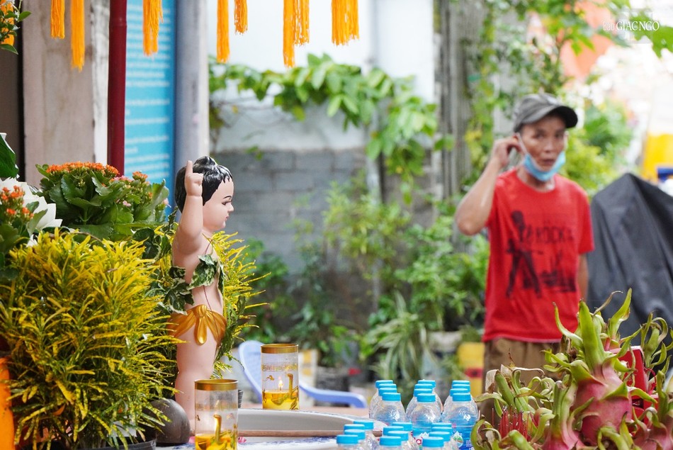 Lễ đài Phật đản được bà con hẻm 159 Trần Văn Đang chuẩn bị và hoàn thiện từ ngày mùng 5-4 ÂL và sau đó thỉnh các thầy về cử hành lễ an vị Phật, thực hiện nghi thức Tắm Phật.