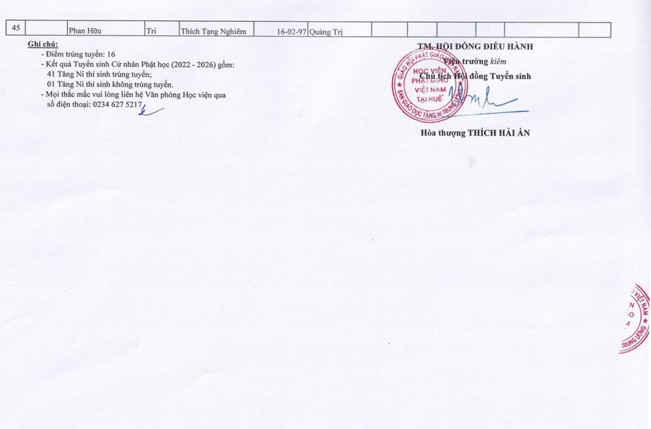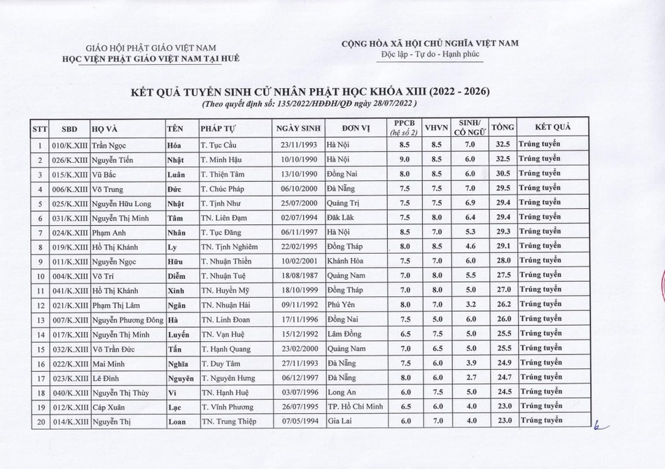 Được biết, kỳ tuyển sinh này có 42 Tăng Ni thí sinh tham dự kỳ thi, trong đó có 41 thí sinh trúng tuyển và 1 thí sinh không trúng tuyển.