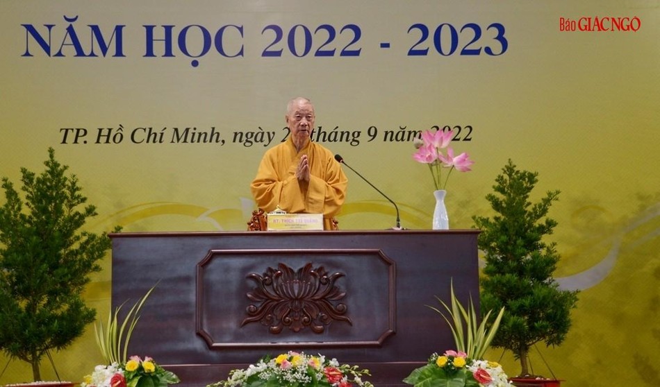 GNO - Trưởng lão Hòa thượng Thích Trí Quảng, Quyền Pháp chủ GHPGVN, Viện trưởng Học viện đã quang lâm chứng minh, có lời huấn thị tại buổi lễ khai giảng năm học mới 2022-2023 trước hơn 2.600 Tăng Ni sinh viên các khóa.