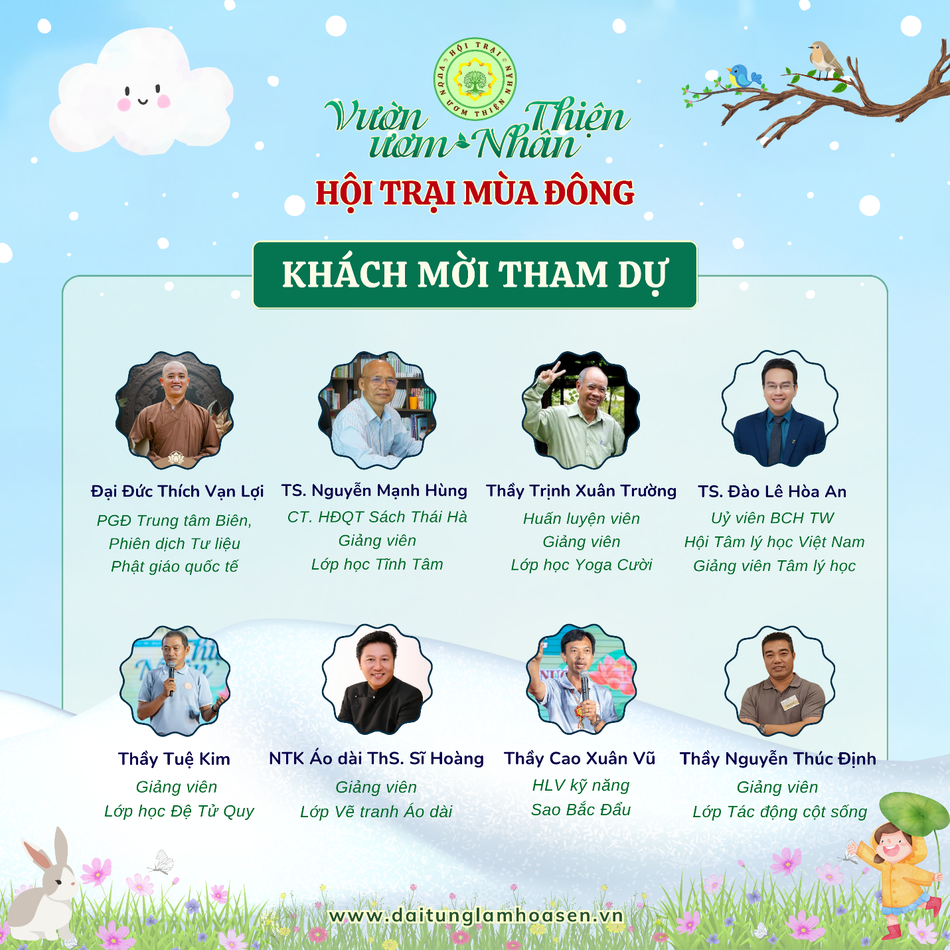 Khách mời của chương trình Hội trại mùa đông lần này có: Đại đức Thích Vạn Lợi, Tiến sĩ Phật học, hiện là Phó Giám đốc Trung tâm Biên, Phiên dịch Tư liệu Phật giáo Quốc tế thuộc Ban Phật giáo Quốc tế T.Ư; Tiến sĩ Nguyễn Mạnh Hùng, Chủ tịch Hội đồng Quản trị và là người sáng lập Sách Thái Hà; Tiến sĩ Tâm lý học Đào Lê Hòa An, Ủy viên Ban Chấp hành Trung ương Hội Tâm lý học Việt Nam; Huấn luyện viên bộ môn Yoga Cười Trịnh Xuân Trường; Lương y Nguyễn Thúc Định, Hội Tác động cột sống Việt Nam; Nhà thiết kế áo dài Sỹ Hoàng...