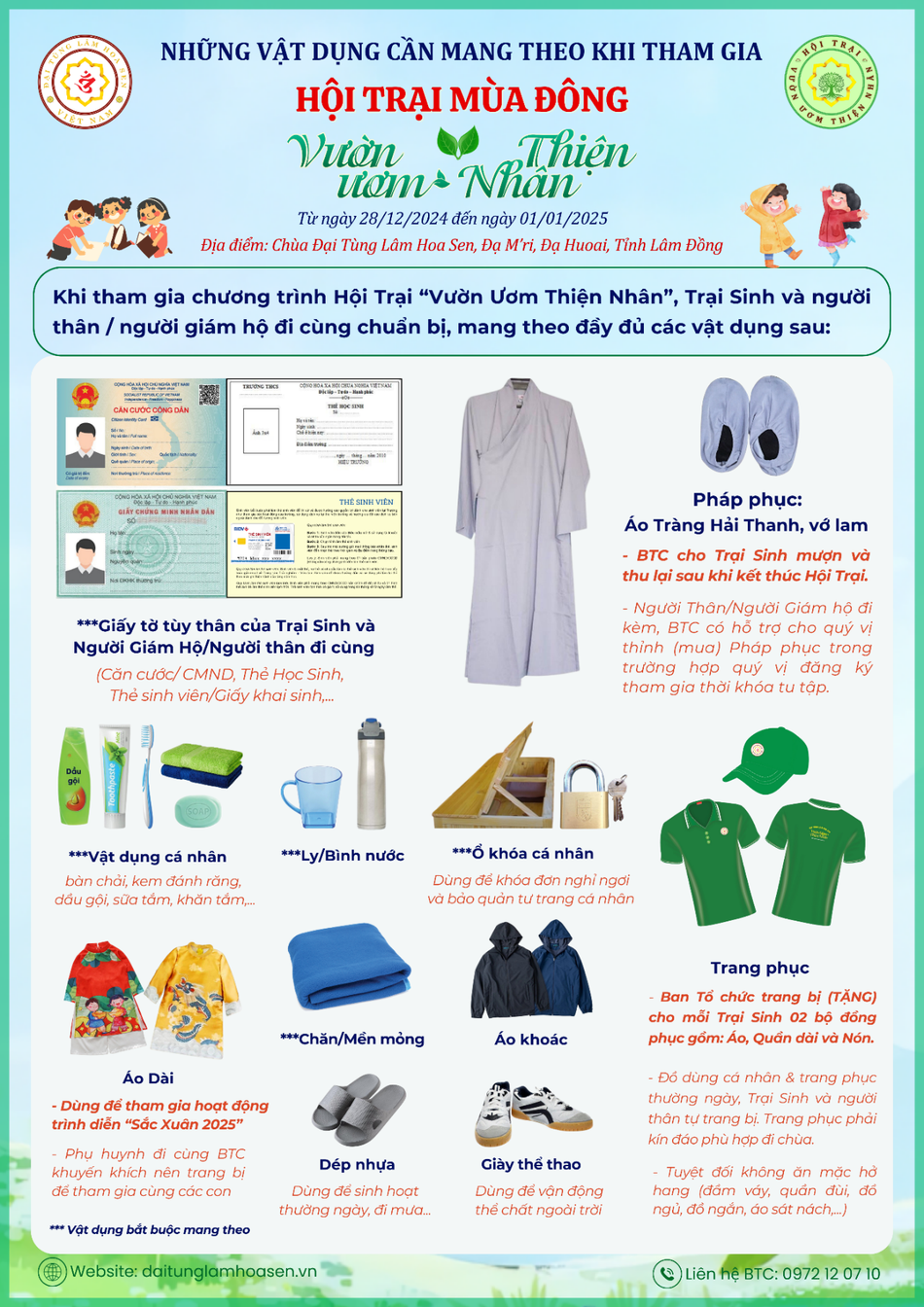 Chương trình hoàn toàn miễn phí. Ban Tổ chức có hỗ trợ xe đưa - đón các em Thanh thiếu niên cũng như quý phụ huynh, người thân đi cùng di chuyển từ Công viên Gia Định, TP.HCM đến Đại tùng lâm Hoa Sen và ngược lại. Ngoài ra, Ban Tổ chức còn tặng cho các em trại sinh 2 bộ áo quần đồng phục và nón.
