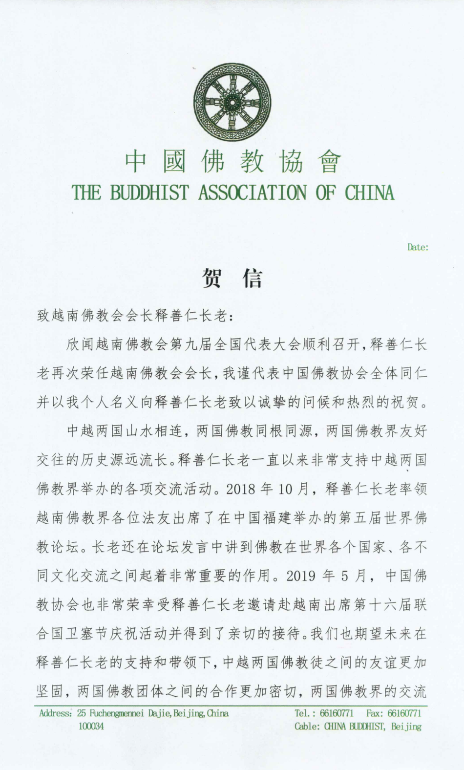 Theo đó, thư chúc mừng của Trưởng lão Hòa thượng Thích Diễn Giác, Hội trưởng Hiệp hội Phật giáo Trung Quốc ấn ký kính gửi đến Đại Trưởng lão Hòa thượng Thích Trí Quảng, Pháp chủ Hội đồng Chứng minh và Trưởng lão Hòa thượng Thích Thiện Nhơn, Chủ tịch Hội đồng Trị sự Giáo hội Phật giáo Việt Nam.
