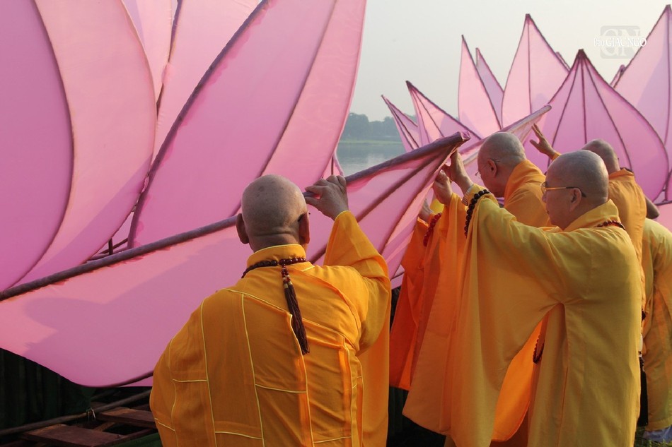 Chư tôn đức cử hành lễ tâm linh trước khi hạ thủy 7 hoa sen |
