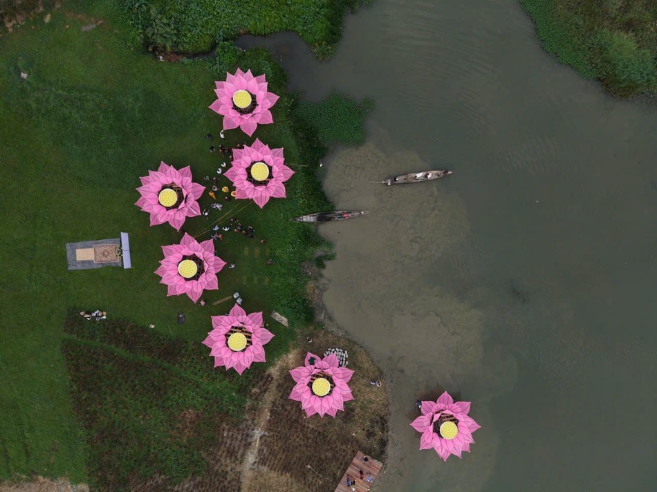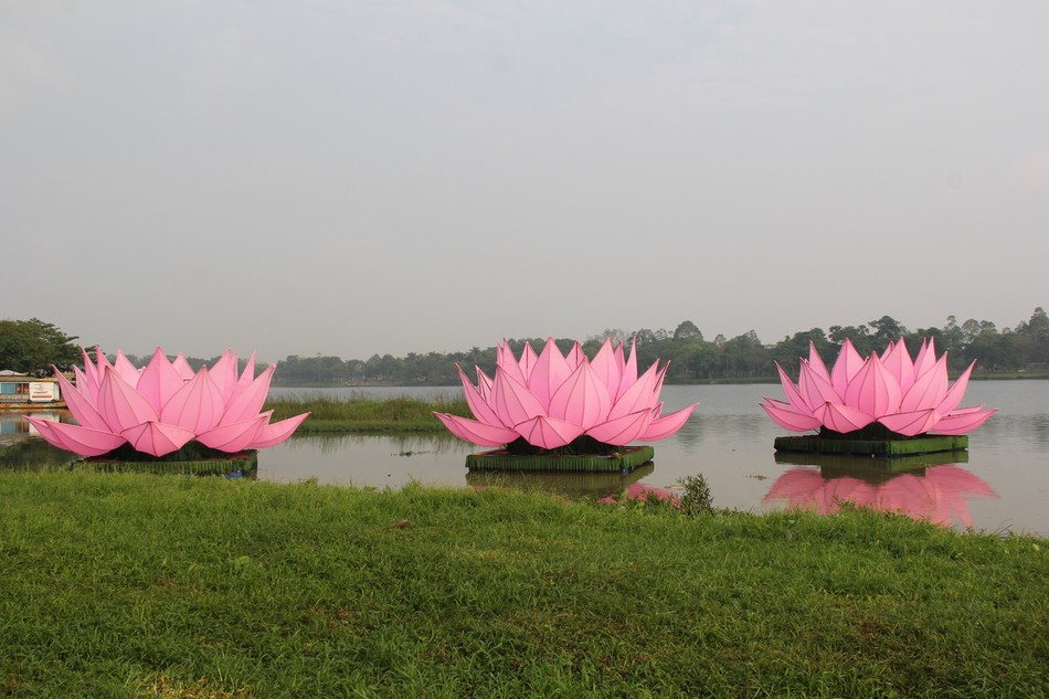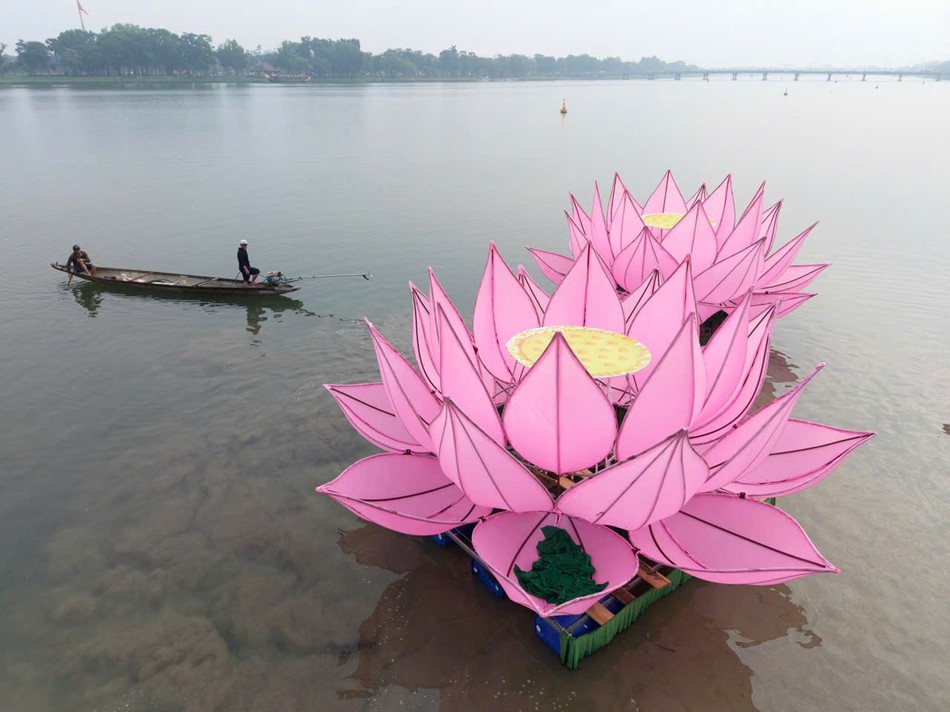 Trước đó, 168 cánh sen được Ni sinh Học viện Phật giáo VN tại Huế thực hiện dán vải lên bộ khung sườn. Sau đó vận chuyển từ Học viện Phật giáo VN tại Huế về tập kết tại bờ sông Hương.