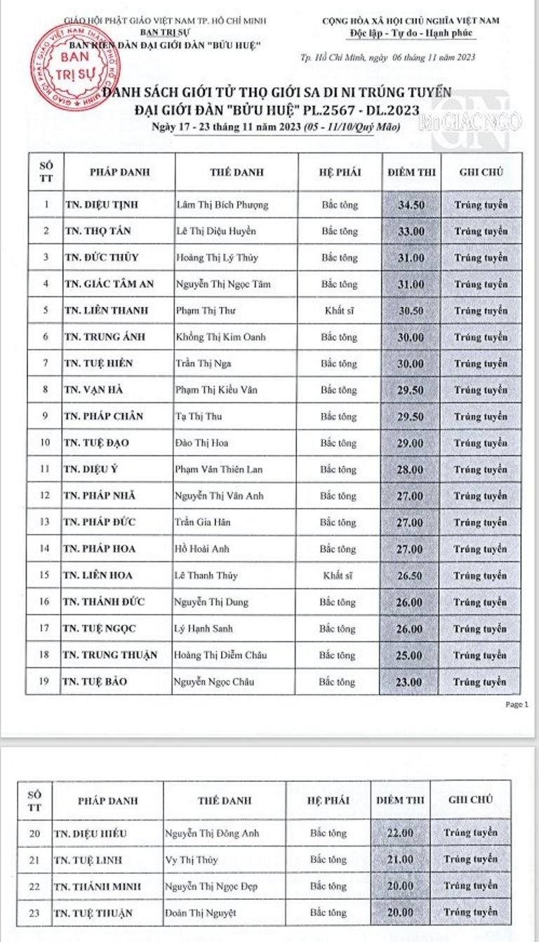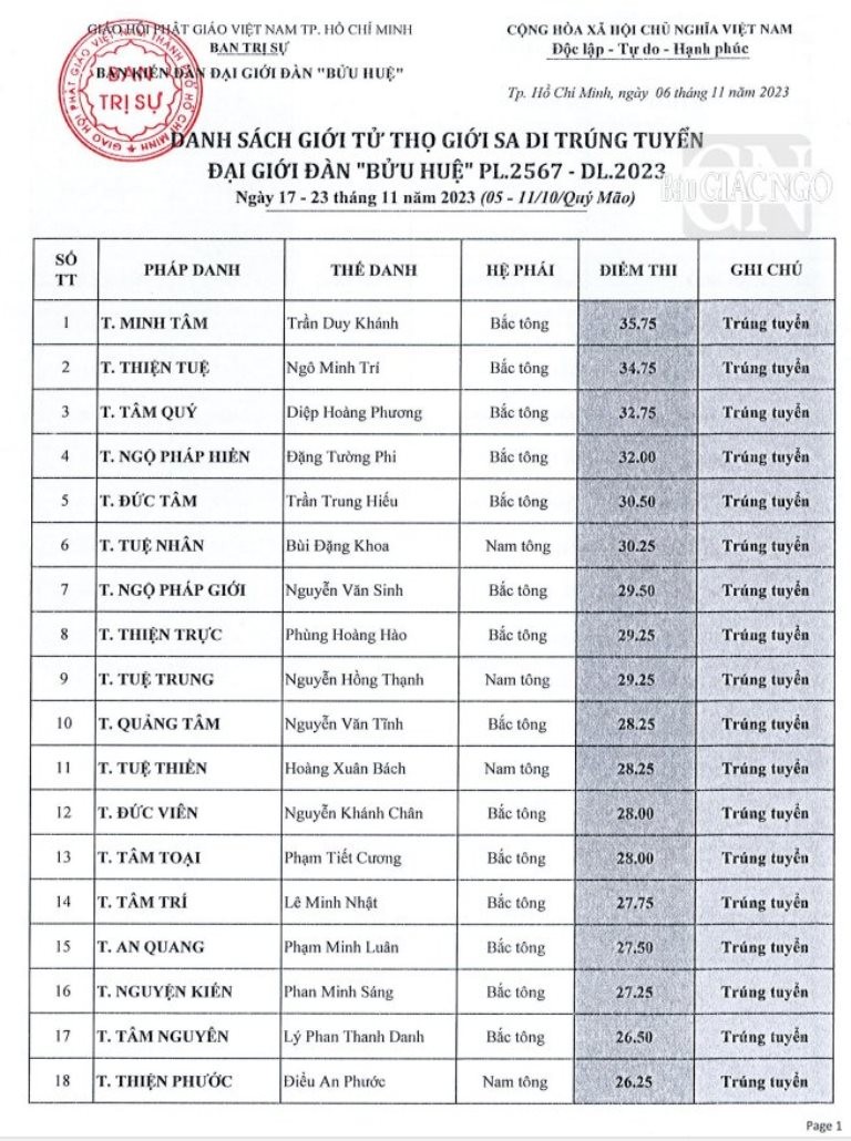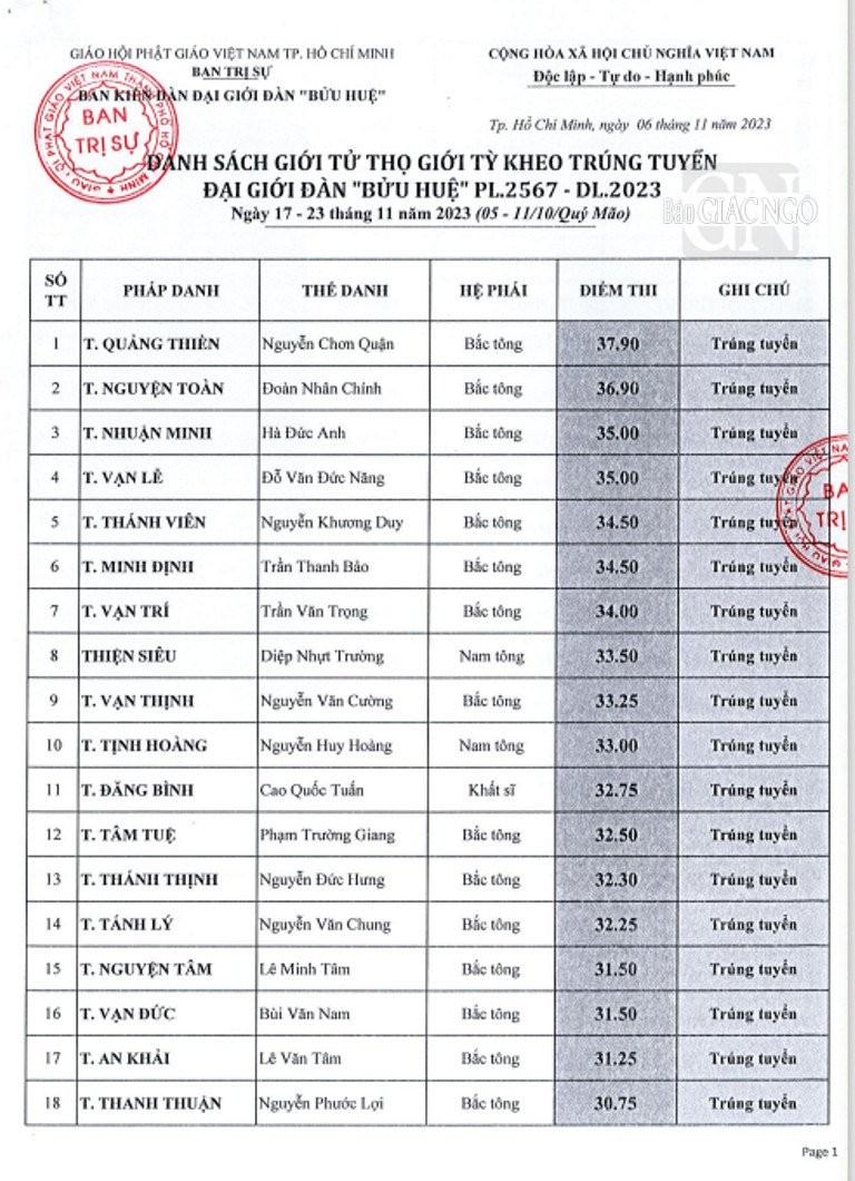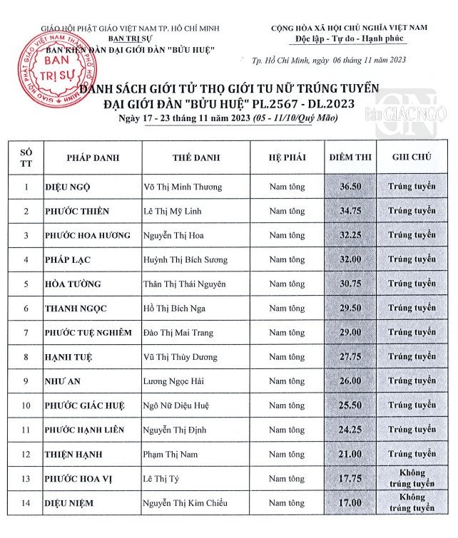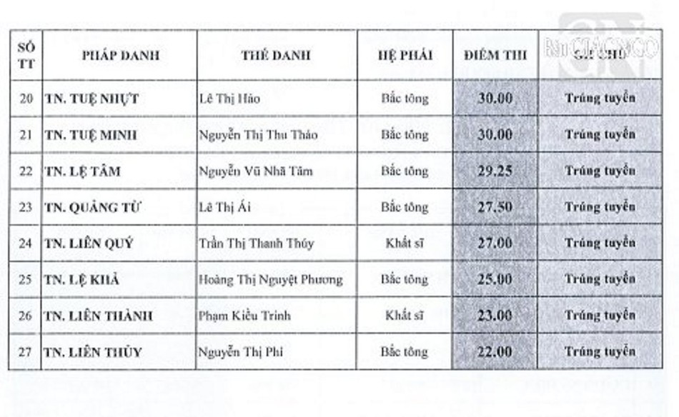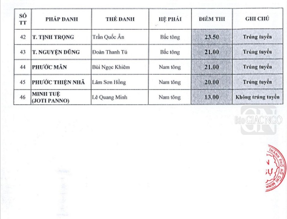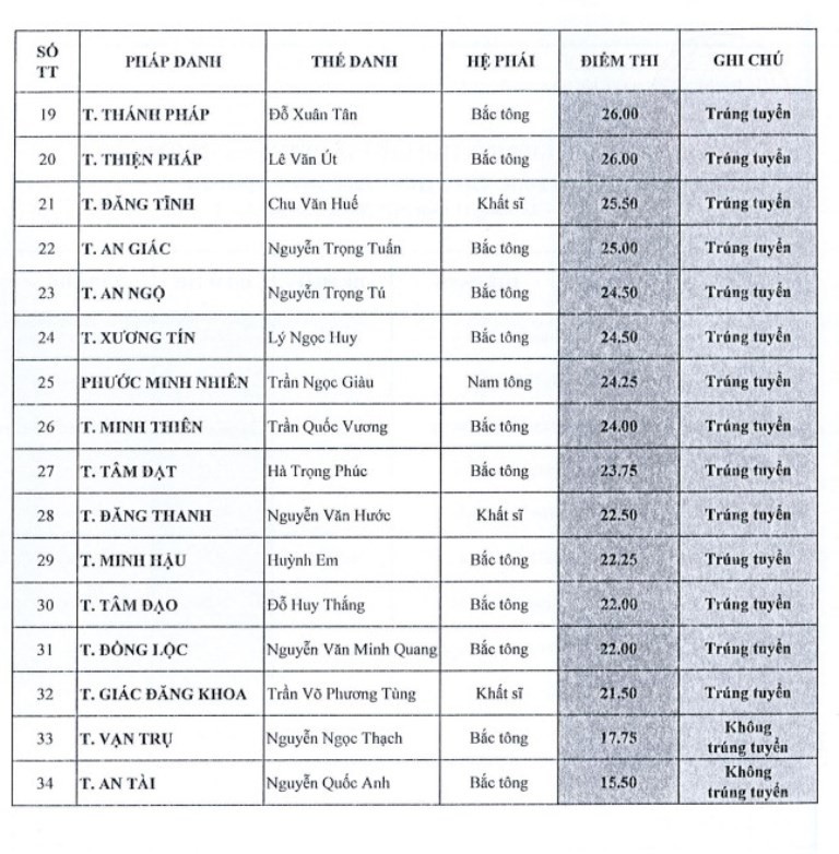 Theo đó, giới tử các hệ phái Bắc tông, Nam tông, Khất sĩ phải tham dự thi vấn đáp, thi viết; riêng giới tử Bắc tông còn thi tụng luật. Kết quả được công bố như sau: