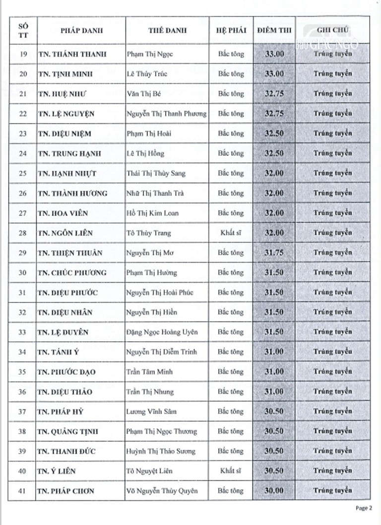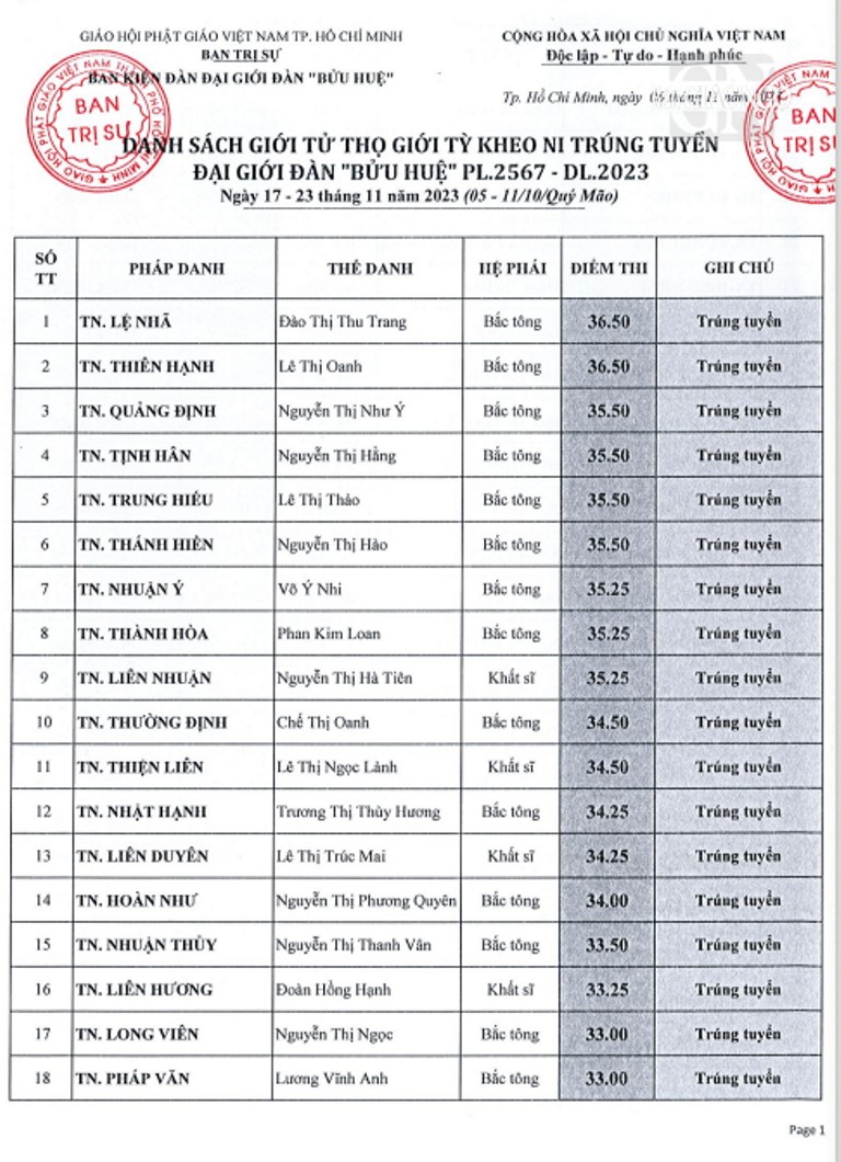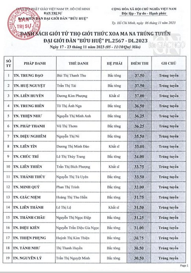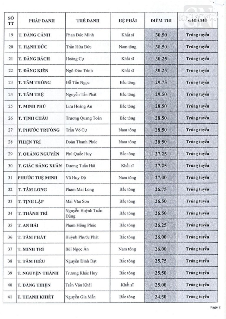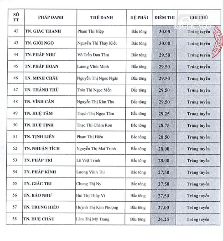 Theo đó, giới tử các hệ phái Bắc tông, Nam tông, Khất sĩ phải tham dự thi vấn đáp, thi viết; riêng giới tử Bắc tông còn thi tụng luật. Kết quả được công bố như sau: