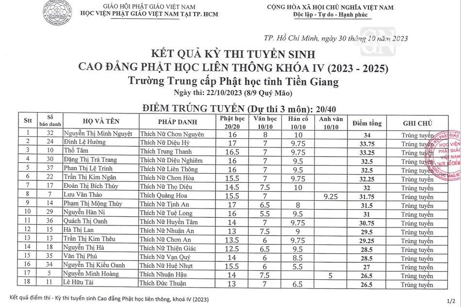 Điểm thí sinh dự kỳ tuyển sinh Cao đẳng liên thông của Trường Trung cấp Phật học Tiền Giang |