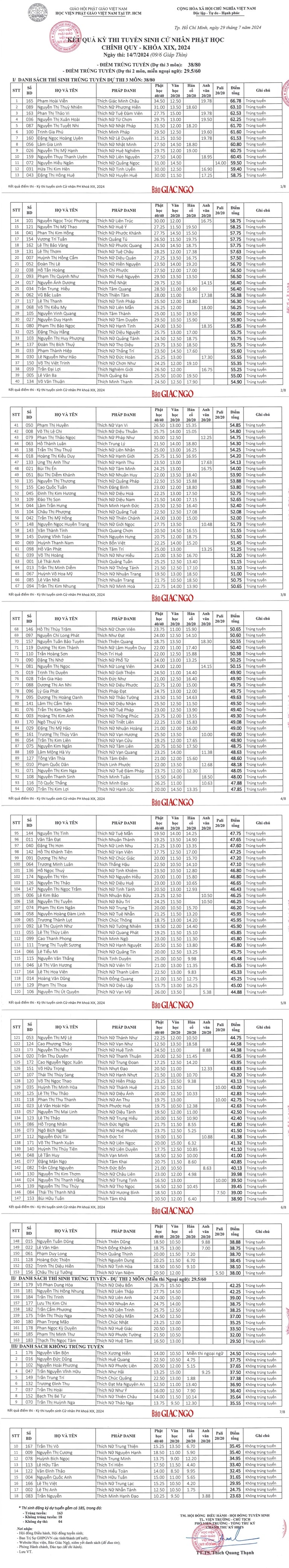 Theo đó, điểm trúng tuyển đối với các thí sinh dự thi 3 môn được ấn định là 38/80; với các thí sinh miễn thi ngoại ngữ là 29,5/60.