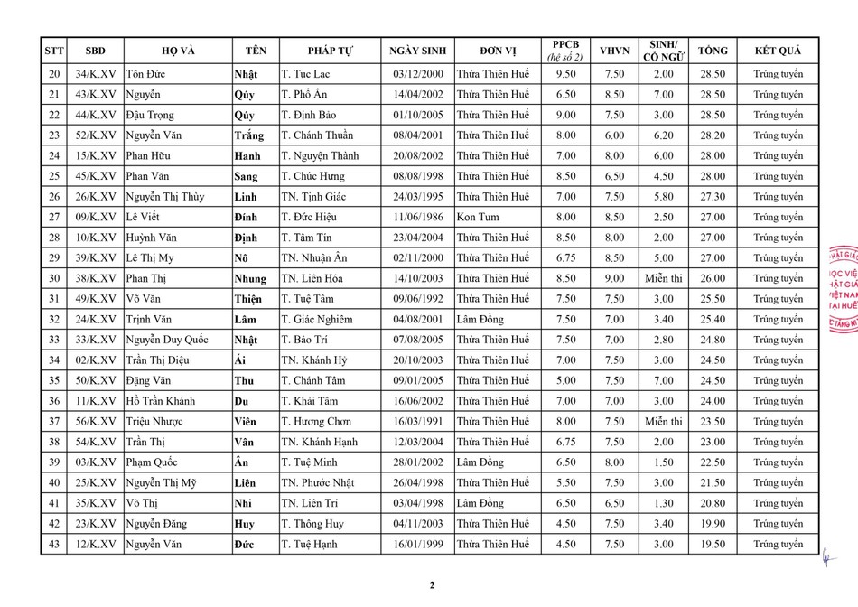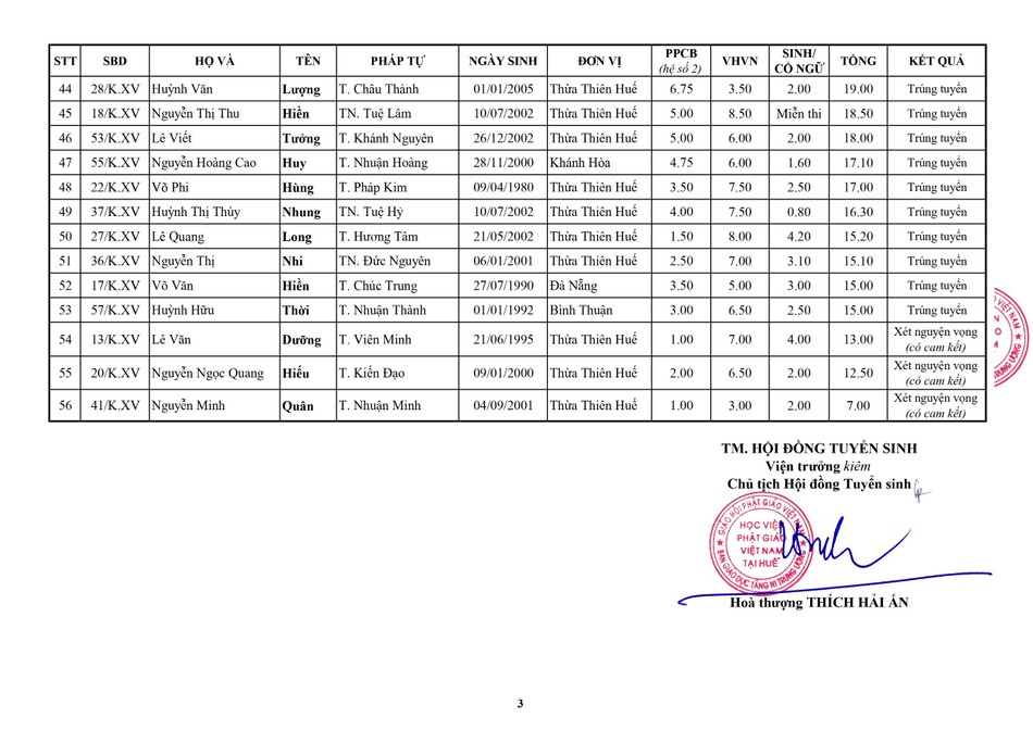 Theo đó, điểm trúng tuyển cử nhân Phật học khóa XV (2024-2028) là 15/30, môn Phật pháp căn bản (hệ số 2), Văn học Việt Nam và Ngoại ngữ (hệ số 1).