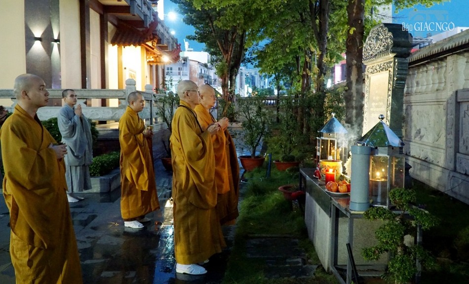 Chư tôn đức cũng thực hiện nghi thức thượng phan; thắp hương tưởng niệm tại Bia tưởng niệm chiến sĩ, các y bác sĩ, tình nguyện viên, đồng bào qua đời trong đại dịch Covid-19, trong khuôn viên Việt Nam Quốc Tự.