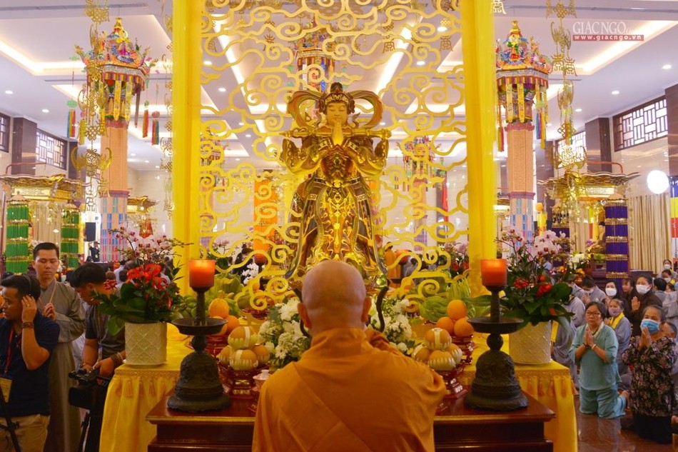 Trong không gian tâm linh của đàn tràng, Hòa thượng Thích Lệ Trang, Trưởng ban Trị sự GHPGVN TP.HCM đã niêm đàn sái tịnh, bạch Phật khai kinh; Thượng tọa Thích Quảng Chơn, cùng chư tôn đức Ban Nghi lễ TP.HCM thực hiện các nghi thức thỉnh Tiêu Diện Đại sĩ, cùng với sự tham dự của chư tôn đức các hệ phái Phật giáo, Phật tử các đạo tràng, thân nhân các gia đình có người thân qua đời trong đại dịch Covid-19 tham dự trang nghiêm tại đàn tràng, nhất tâm hiệp lực cầu nguyện.