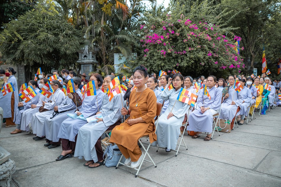 Trong không khí trang nghiêm, hương trầm quyện tỏa, chuông trống Bát-nhã trầm hùng, chư tôn Hòa thượng chứng minh niêm hương, đoàn Gia đình Phật tử dâng hoa cúng dường dâng lên Đức Thế Tôn nhân ngày đản sanh của Ngài.